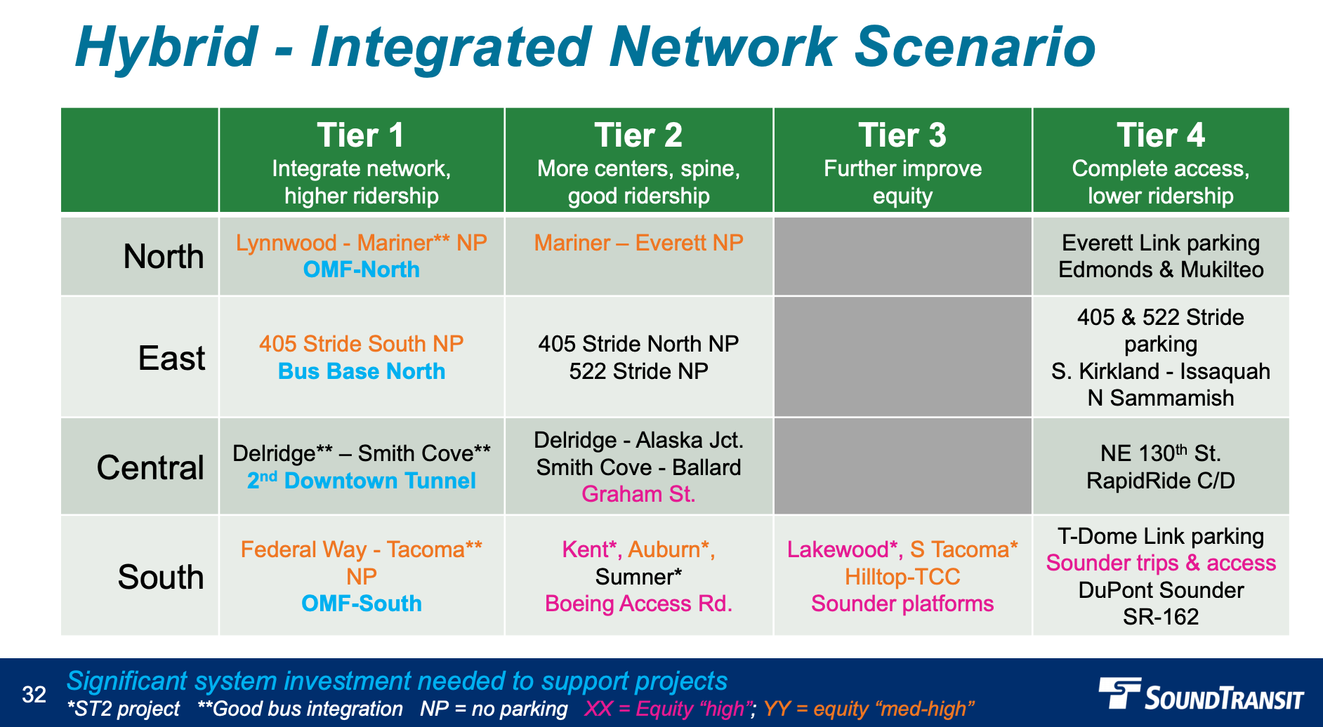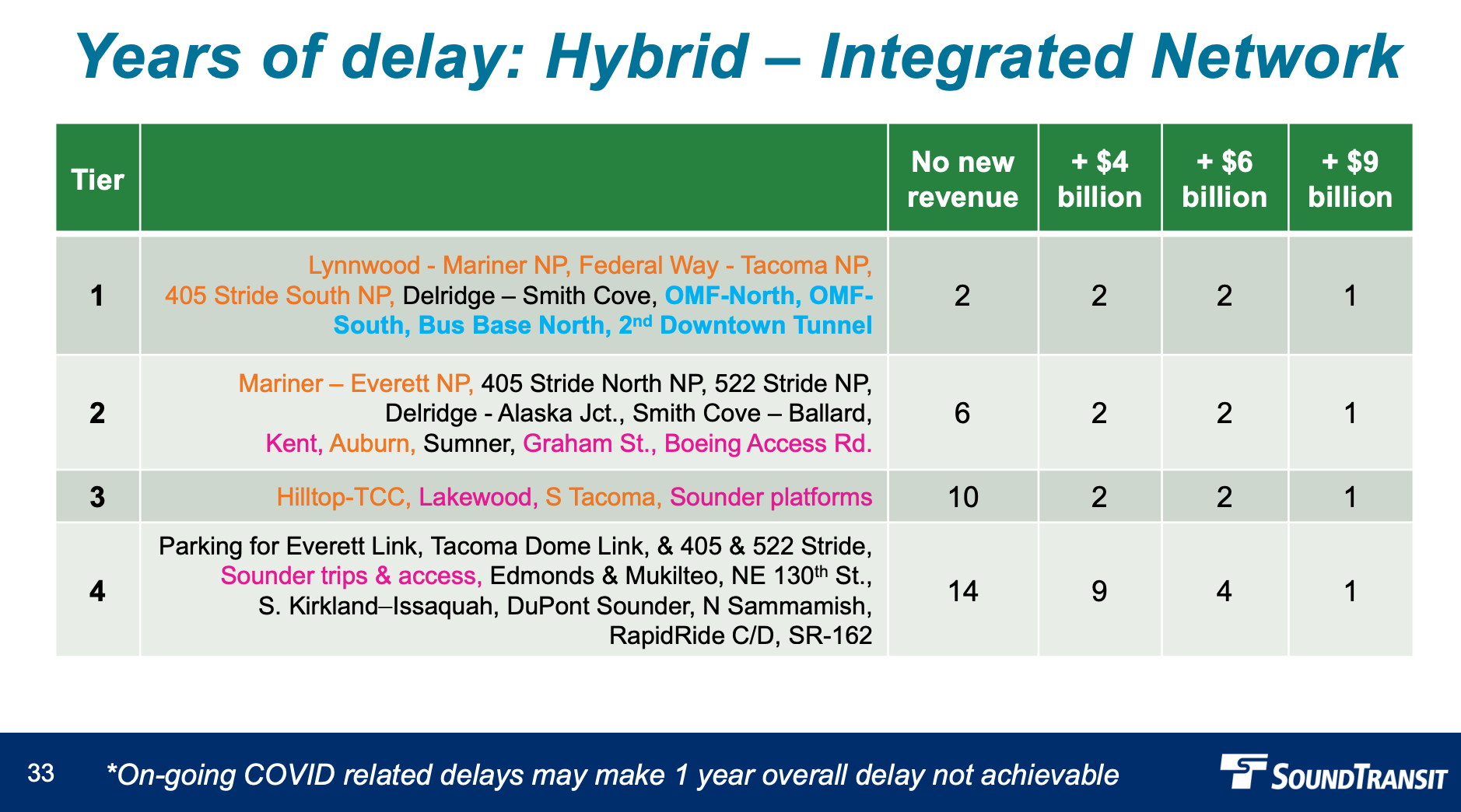- Finally, the “hybrid integrated network” scenario pairs parking delay with a variety of priorities similarly to deliver most transit projects with only a two-year delay. Key projects that would fall further behind include the South Kirkland-Issaquah light rail extension, DuPont Sounder extension, and NE 130th St infill station. Parking and other lower tiered projects would thus be delayed by nine years.