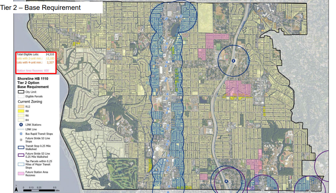 The “Tier 2.5” option developed by Shoreline city staff would have expanded the footprint of lots required to allow four units to within a half-mile of transit, greatly expanding the potential reach of “missing middle” multiplexes on either side of Aurora Avenue N and further out from the 148th and 185th Street light rail stations. It also would have allowed fourplexes on lots within a quarter mile of “activity centers” — commercial districts that do have some transit but not to the level where changes would be required by HB 1110.