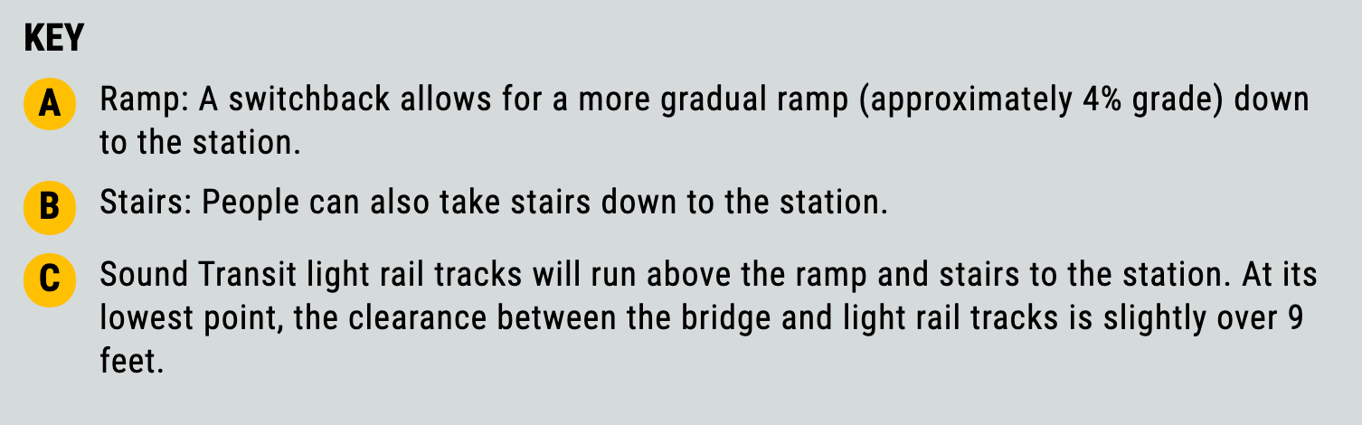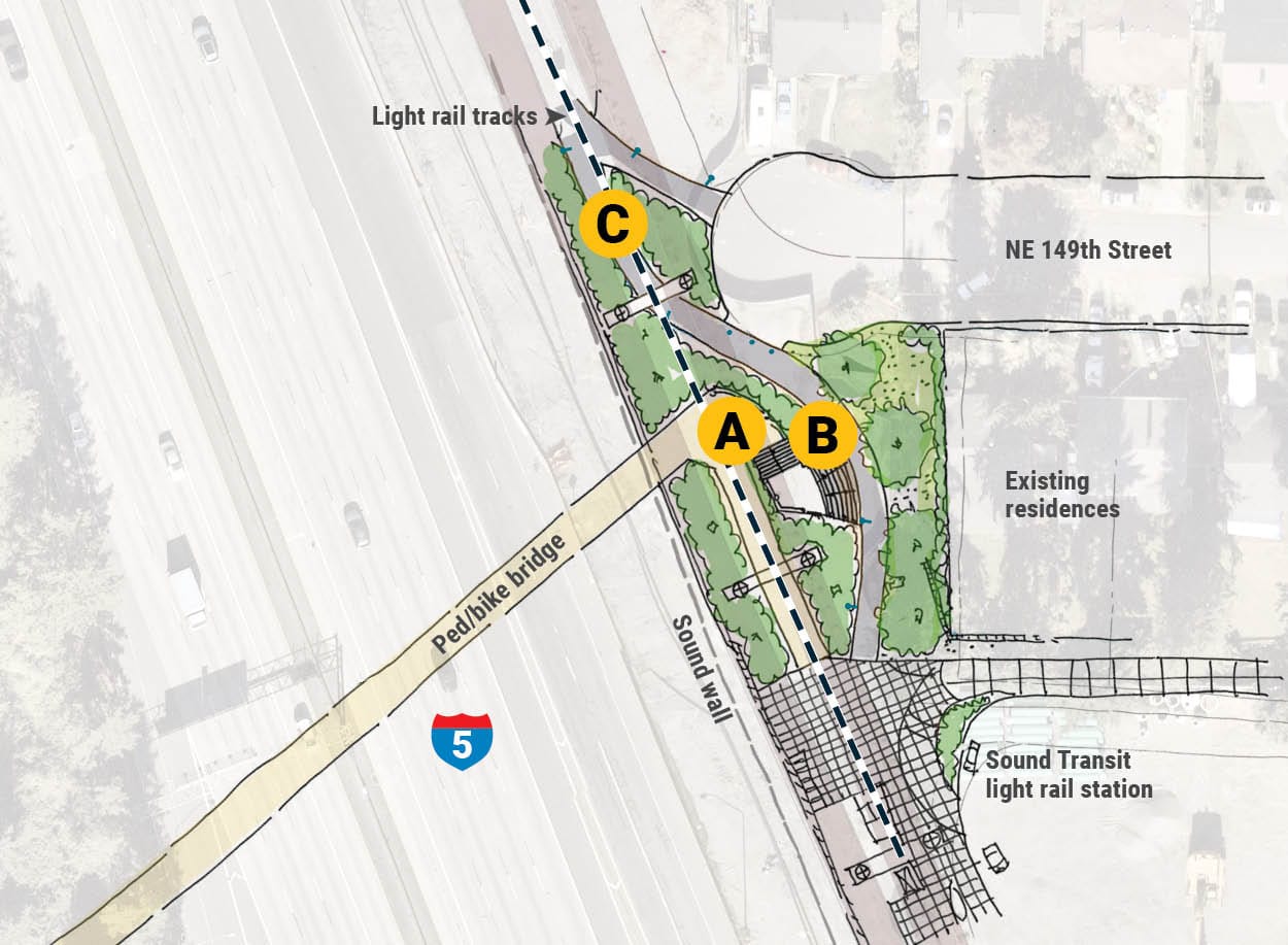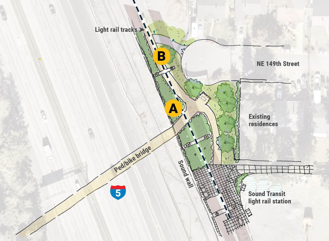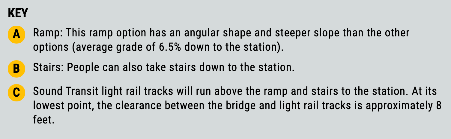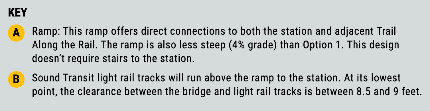 Shoreline has also drafted some options for how the east side of the bridge would connect to the Trail Along The Rail and station. The three options differ in how the bridge ties into these connections, either directly or switching back.