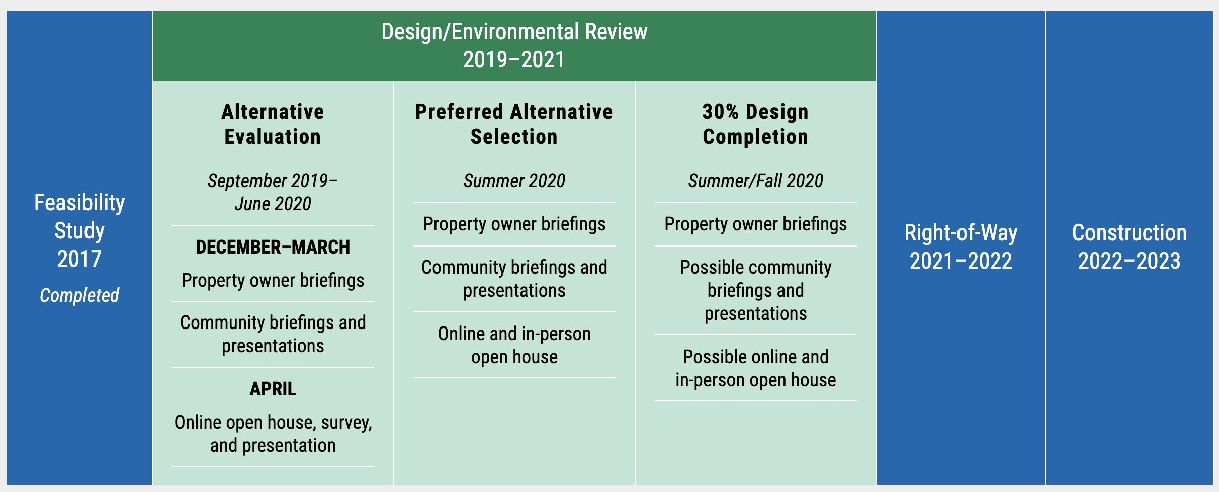 Shoreline is seeking feedback on the conceptual design alternatives through May 1st. The public can provide input through the online open house. Shoreline plans to select design alternatives this summer and then move into deeper design work that will reach 30% design by fall. Touch points for public participation will happen during the year to further inform the ultimate design. Right-of-way acquisition will follow in 2021 and 2022 with construction beginning in 2022. The bridge should open in time for light rail, and possibly well before, in 2023.