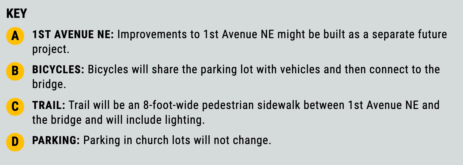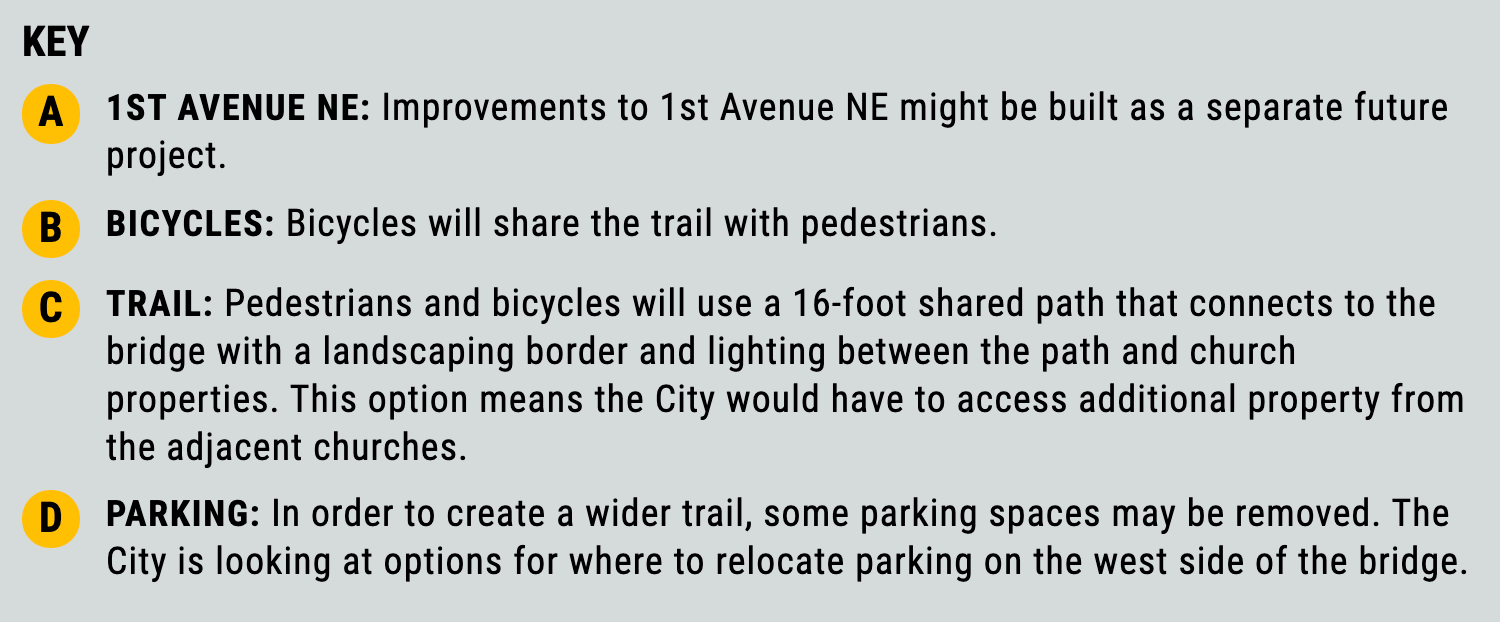 For the west side connection, the bridge has two key options to reach 1st Ave NE. The first option would require minimal interventions to NE 148th St. A small pedestrian trail would be constructed on the north side of the street, which is currently just a parking lot drive aisle. In-street bike sharrow markings would also be added with parking retained. The second option would go much further to create a 16-foot-wide multi-use trail connection and reduce some parking for the drive aisle.