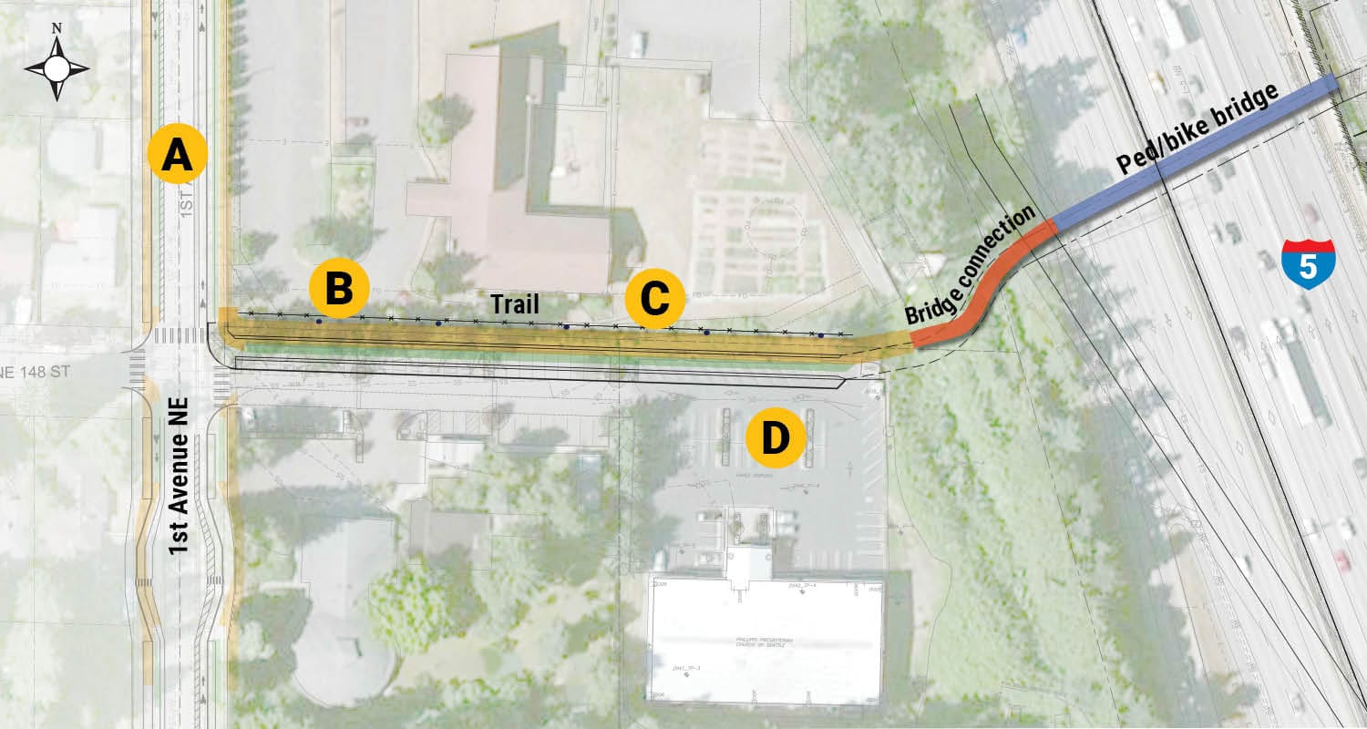 Currently, there are two crossings of I-5 at NE 145th St and NE 155th St, though they are not terribly welcoming to people walking and biking–particularly NE 145th St. A separate project may wind up taming N/NE 145th St as part of a multimodal, multi-jurisdictional effort though. Shoreline is also developing plans for a trail, known as the “Trail Along The Rail“, that would follow along the east side of the light rail corridor. The trail could run about 60 or so blocks from NE 145th St to NE 195th St, linking neighborhoods in between Shoreline’s two future light rail stations.