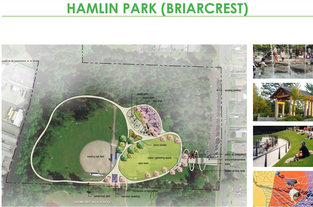 - Briarcrest Community Park, which would be carved out of existing Hamlin Park, just north of Shorecrest High School. Proposed improvements include an enhanced entrance from 25th Ave, a new perimeter trail, new public gathering space, and conversion of one of two existing ballfields into new lawn, play area, splash pad, and picnic shelter.