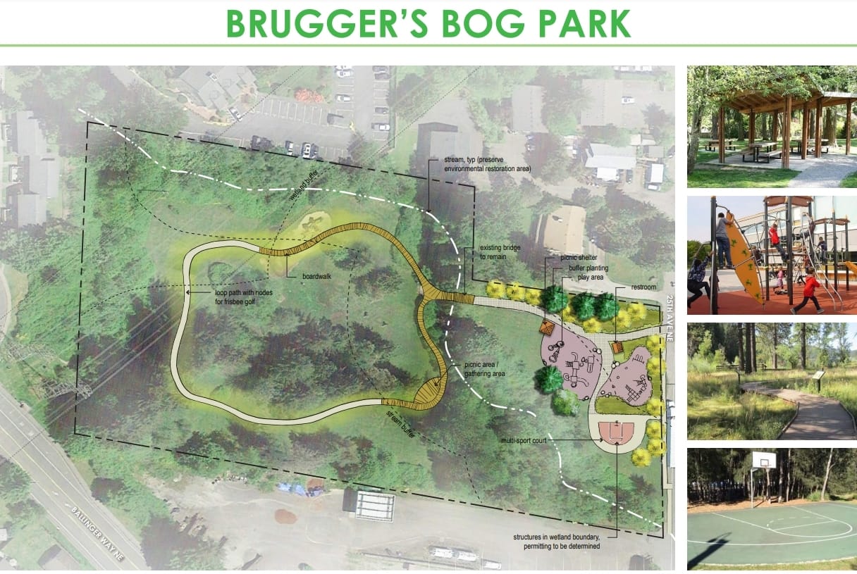 - Brugger’s Bog’s proposed improvements would make amenities and the park in general more accessible. Due to its wetland nature, significant parts of the park flood for several months of the year. Improvements would move the playground to drier land, and construct a boardwalk over the stream and flood prone areas. A new multi-sports court, picnic shelter, restroom facility, perimeter trail, sidewalk, and additional landscaping are also proposed.