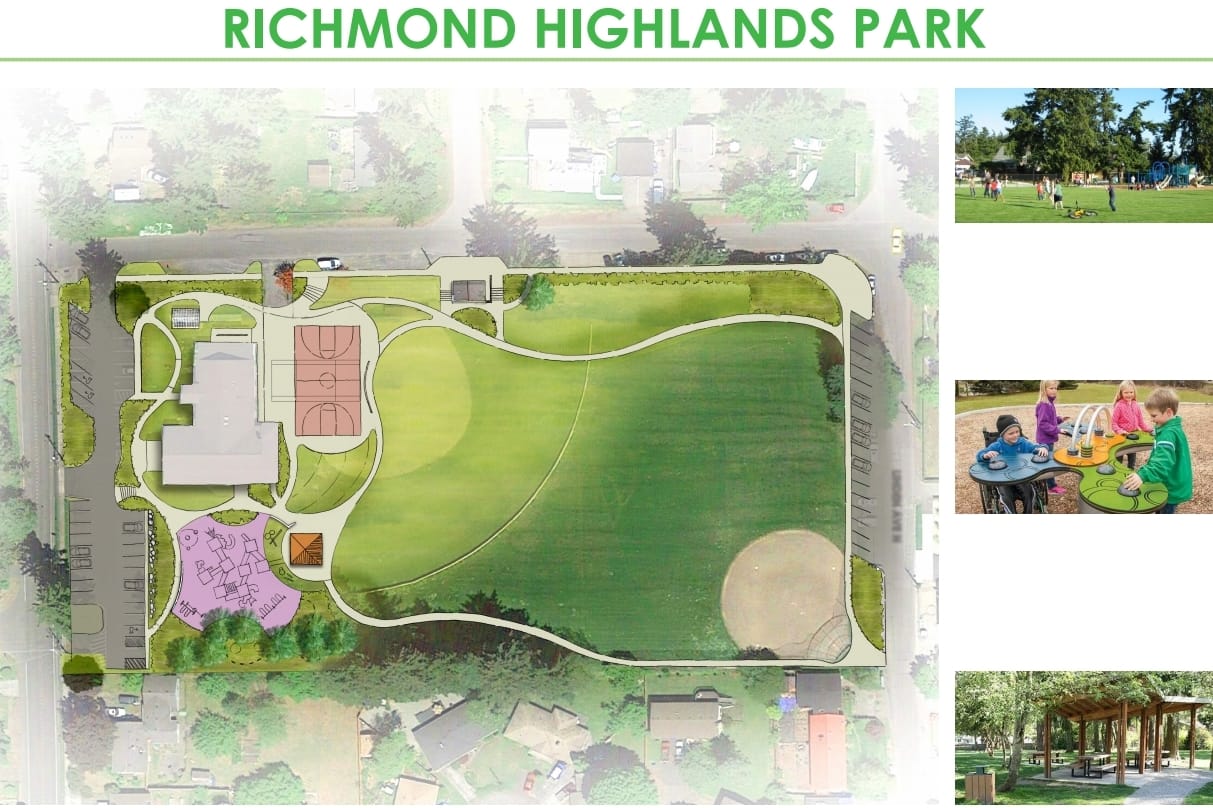 - Richmond Highlands Park’s proposed improvements include conversion of an existing ballfield into a new multi-sport court, law, and picnic shelter. New sidewalks, perimeter and sensory trails are also proposed. The park is also home to the Richmond Highlands Recreation Center, which programs for those with unique physical and mental challenges, so the existing playfield will also be replaced with a fully accessible one.