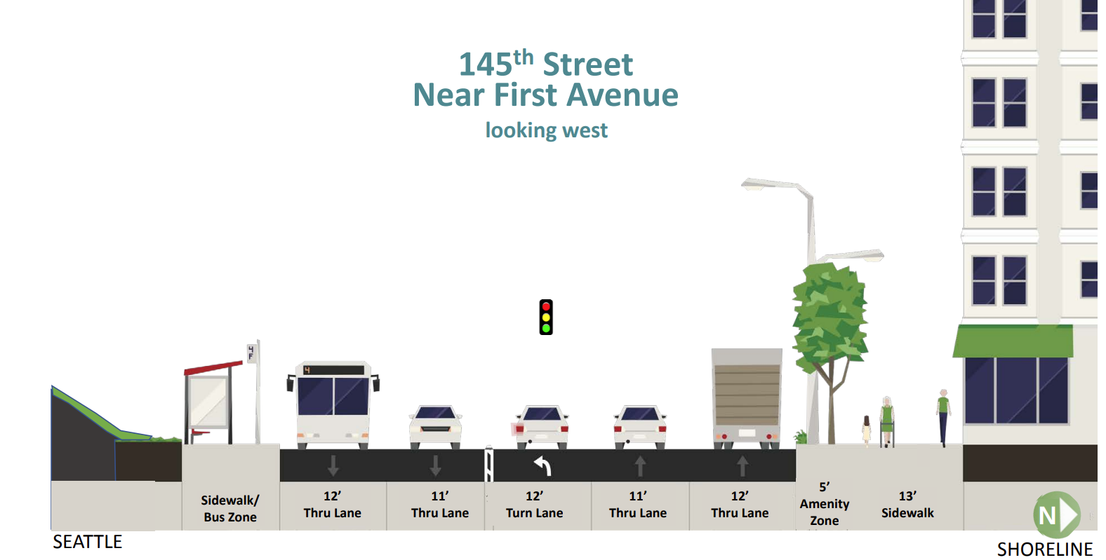 At the same time as roundabout construction, the City of Shoreline is also working to widen 145th Street west of I-5 to add a center turn lane and expand the meager pedestrian facilities along Shoreline’s southern border. Despite acquiring property to expand the roadway, which is a state highway (SR 523), Shoreline did not find any room to include any dedicated space for people on bikes, instead planning to route them via an “off-corridor bike network.”