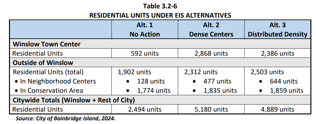Many Bainbridge Island residents are pushing for a third, status-quo oriented option, included in the DEIS as Alternative 1. Under that option, no zoning changes would occur and the city would continue on its current trajectory, with capacity for 592 units within Winslow and only 128 units in the other neighborhood centers. But city planners call that action infeasible given the state direction coming in the form of HB 1220, to say nothing of the city’s Housing Action Plan.