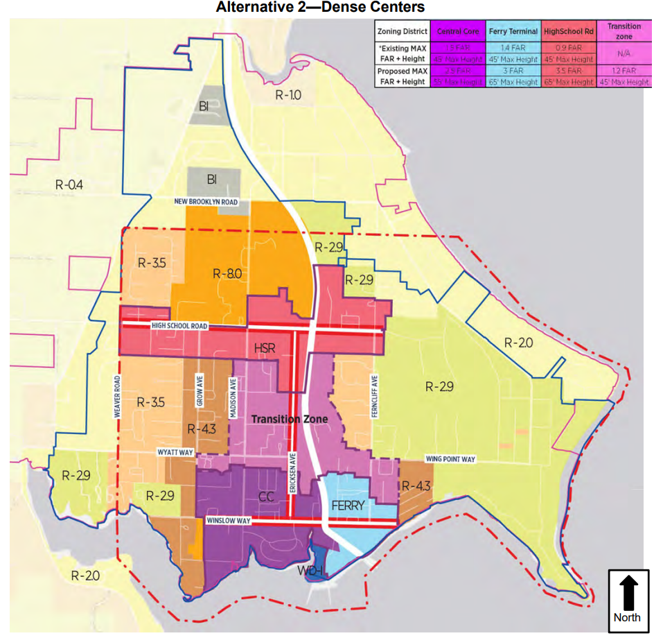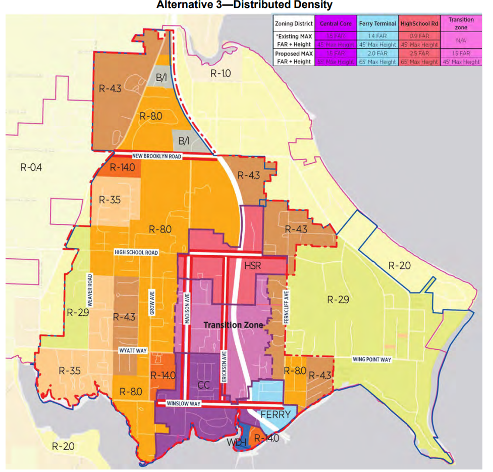 Now it’s up to the Bainbridge City Council to decide exactly how to densify to comply with state law. Earlier this year, the City released a Draft Environmental Impact Statement (DEIS) looking at two potential growth scenarios: one labelled the “dense centers” options and the other “distributed density.” Under the dense centers scenario, Winslow would see the most significant zoning changes to accommodate new development, with modest changes to Bainbridge’s satellite urban centers of Lynwood, Island Center, and Rolling Bay.