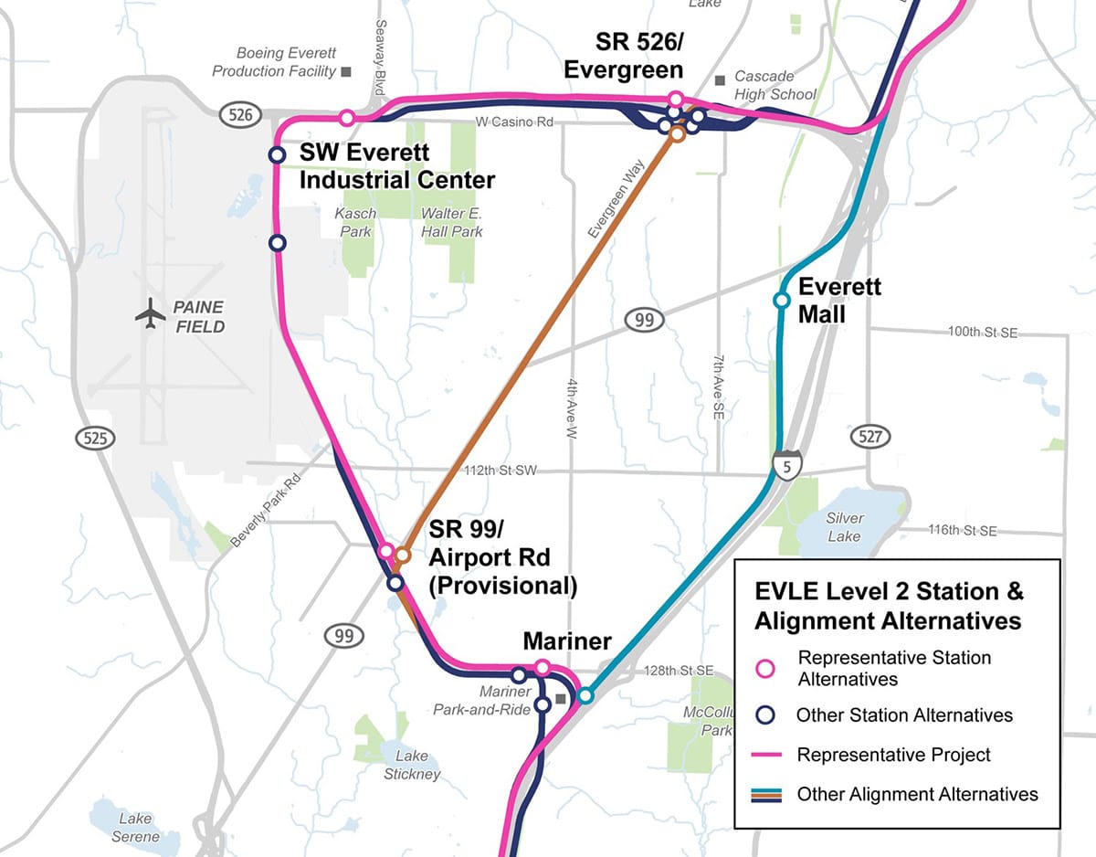 “As for potential infill station locations for the alternative alignments, obvious ones include 112th Street SW/SR 99, SW Everett Mall Way/SR 99, 4th Avenue W/SR 99, 112th Street SE/I-5, and Beverly Boulevard/I-5,” he wrote. The first three would pair with the SR-99 alignment and the latter two with I-5. Adding two infill stations with the Evergreen Way alignment would net more stations for Snohomish County than Paine Field does, and the savings from the more direct route may actually allow the expanded project to happen on time and on budget. Fesler also recommended a variety of other related investments, such as additional bus rapid transit, new pedestrian and bike facilities, and mitigation for community impacts.