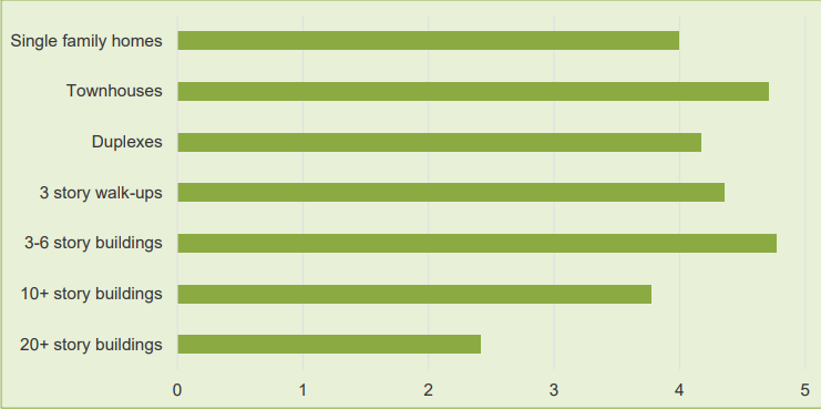 On November 6th, part one of the workshop first shared and solicited reaction to community feedback from the county’s Community Preferences Survey and Residential Housing Type Virtual Workshop. On housing, the last workshop and survey results uncovered mixed but overall promising housing density acceptance by survey participants. Overall, three- to six-story buildings were rated highest for importance to accommodate with townhouses as a close second, and duplexes and three-story walk-ups as strong third and fourth place. Single-family homes were the most divisive with the highest share of greatest importance votes and second highest share of lowest importance votes. Towers of 20+ and 10+ stories were rated as the least important to accommodate, but overall 10+ story buildings were not that far behind single-family homes. Space is made available to comment on these results.