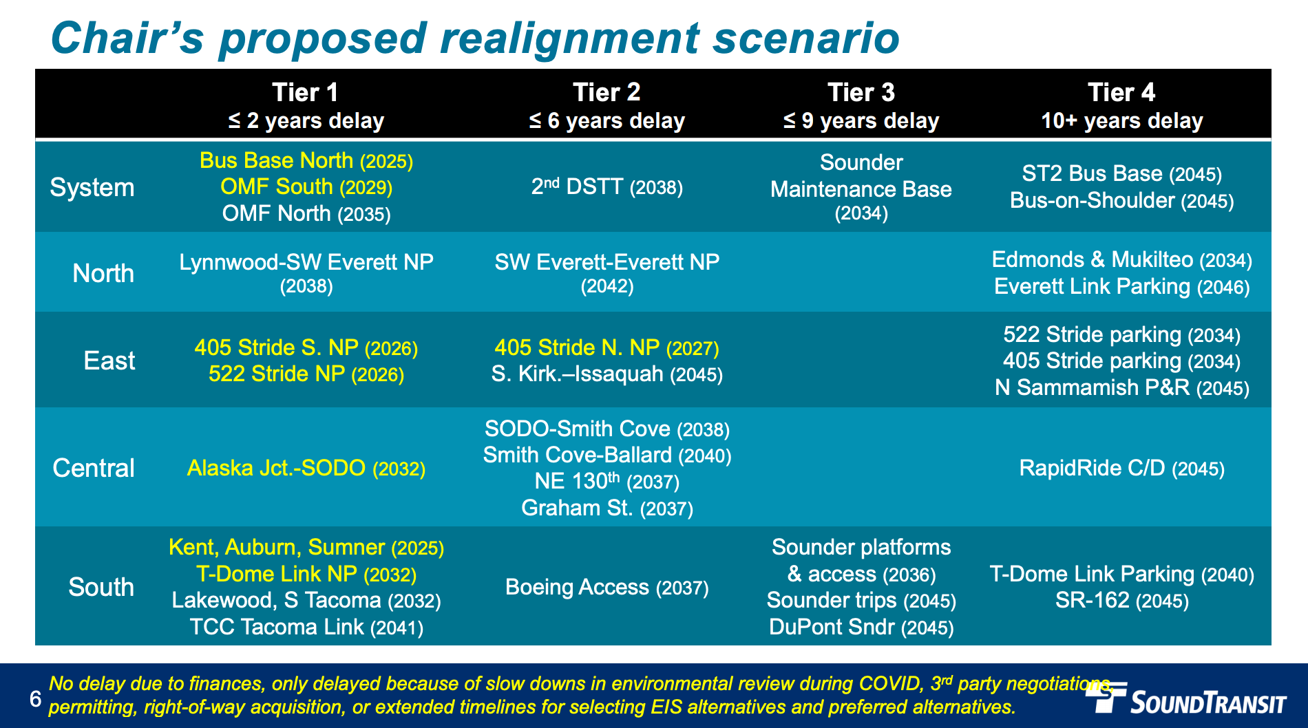 During the meeting, Board Chair Kent Keel said that project timelines would be able to move up a little in his realignment plan. “The $1.4 billion improvement in our financial outlook means, in my mind, that we can improve upon the estimated completion dates for projects,” he said. “So as an example, staff tell me that we can improve the delivery of dates of all of our Tier 2 light rail projects and their supporting systems by a full year. This means we can finish the entire ST3 light rail program, including the infill stations, one year earlier than we anticipated with a $7.9 billion affordability gap.”