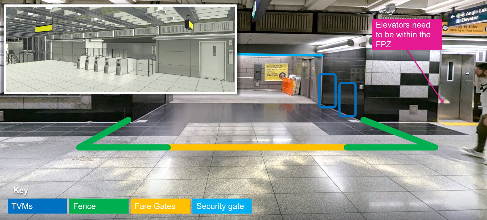 Sound Transit’s existing system relies on riders to tap their ORCA transit cards or buy paper tickets at stations before entering paid fare zones, which are marked with yellow lines in the ground and signage, but no physical barrier.