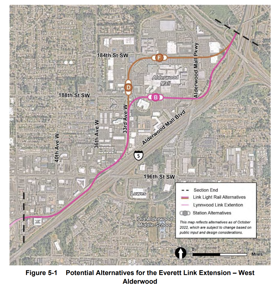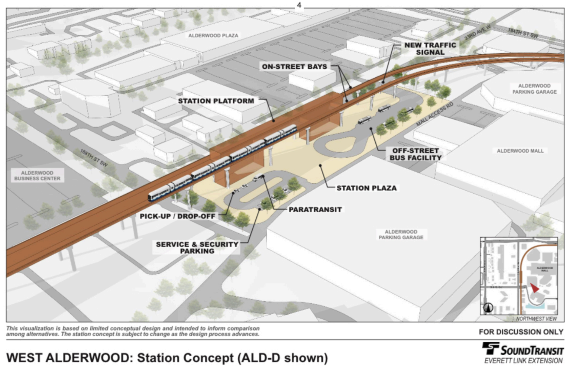 As for the West Alderwood station location alternatives go, ALD-D being preferred is a genuinely good choice. This would put a station in an optimal location for walk-to-station ridership and building up transit-oriented development compared to alternatives that place stations far too close to I-5. But like its alternatives, ALD-D is proposed to be an overbuilt station on private property rather than in the middle of 33rd Avenue W. Sound Transit is proposing to build West Alderwood almost as a transit center with tons of off-street add-ons that are wholly unnecessary. This station isn’t even getting a parking facility. Using a little curb space on 33rd Avenue W would more than suffice for bus stops and security/operations needs.