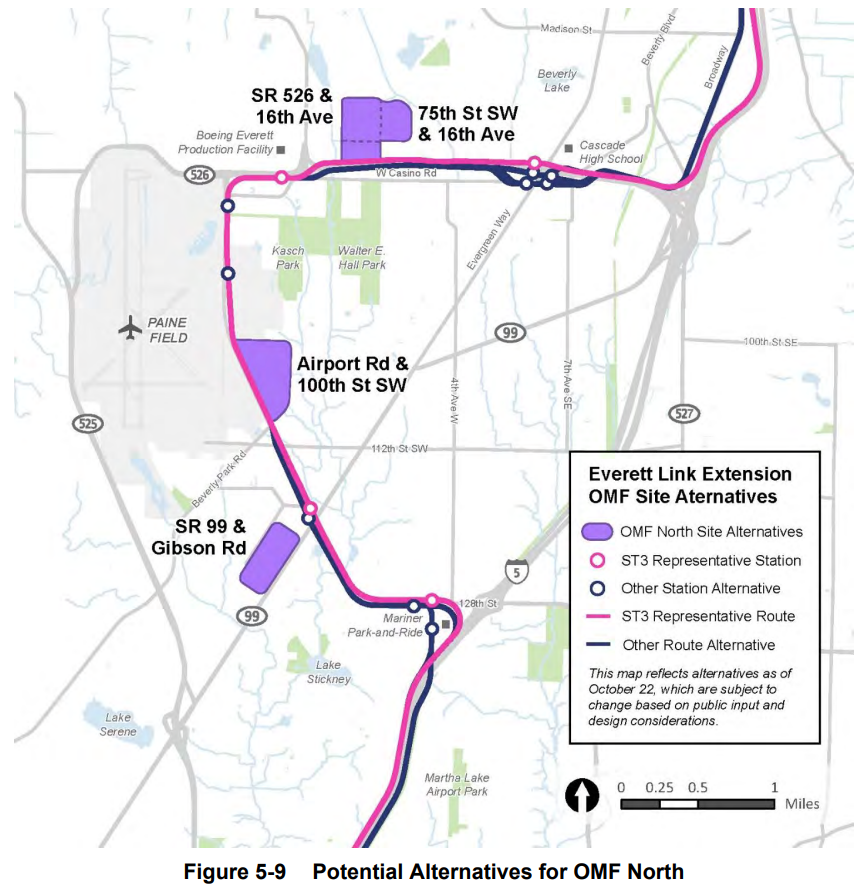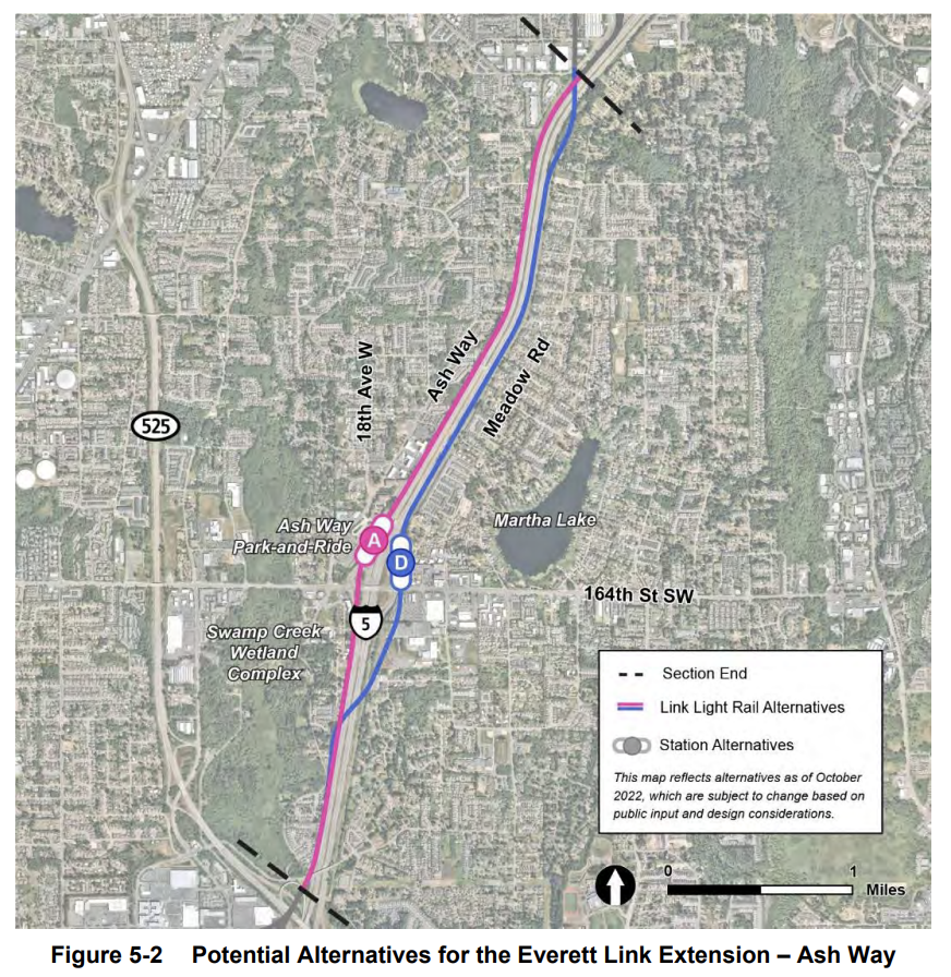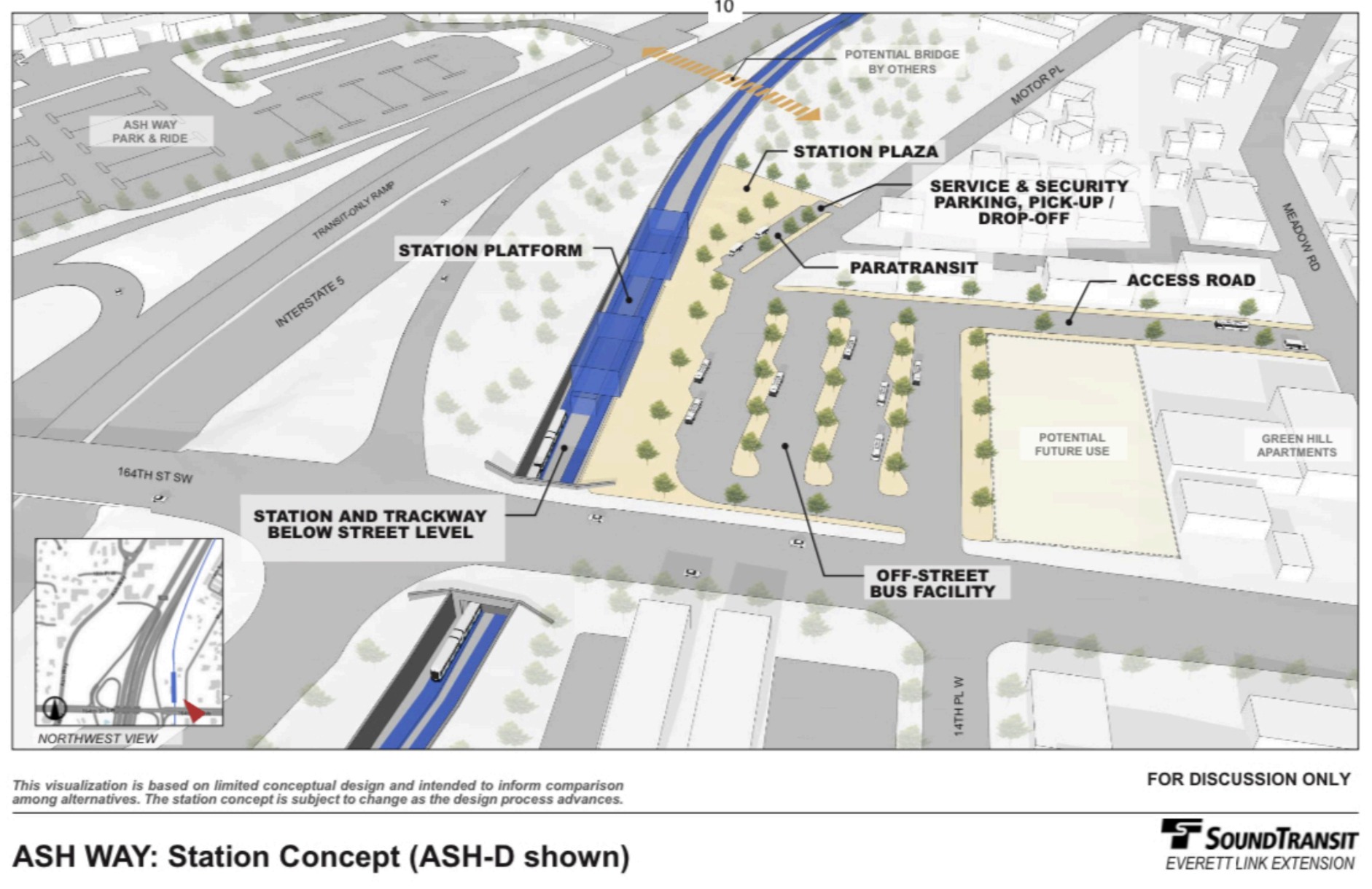 Similarly for Ash Way, Sound Transit is studying a genuinely good alternative east of I-5 (ASH-D) that has better transit-oriented development and walkshed potential, but the station design is on steroids. The agency is seriously considering acquisition of multiple properties, including another church, to build a massive off-street bus facility, replacing the existing one west of I-5. Once the Everett Link Extension opens, express and commuter buses are poised to disappear so there is little apparent benefit of an off-street bus facility over using curb space on 164th Street SW for bus stop zones.