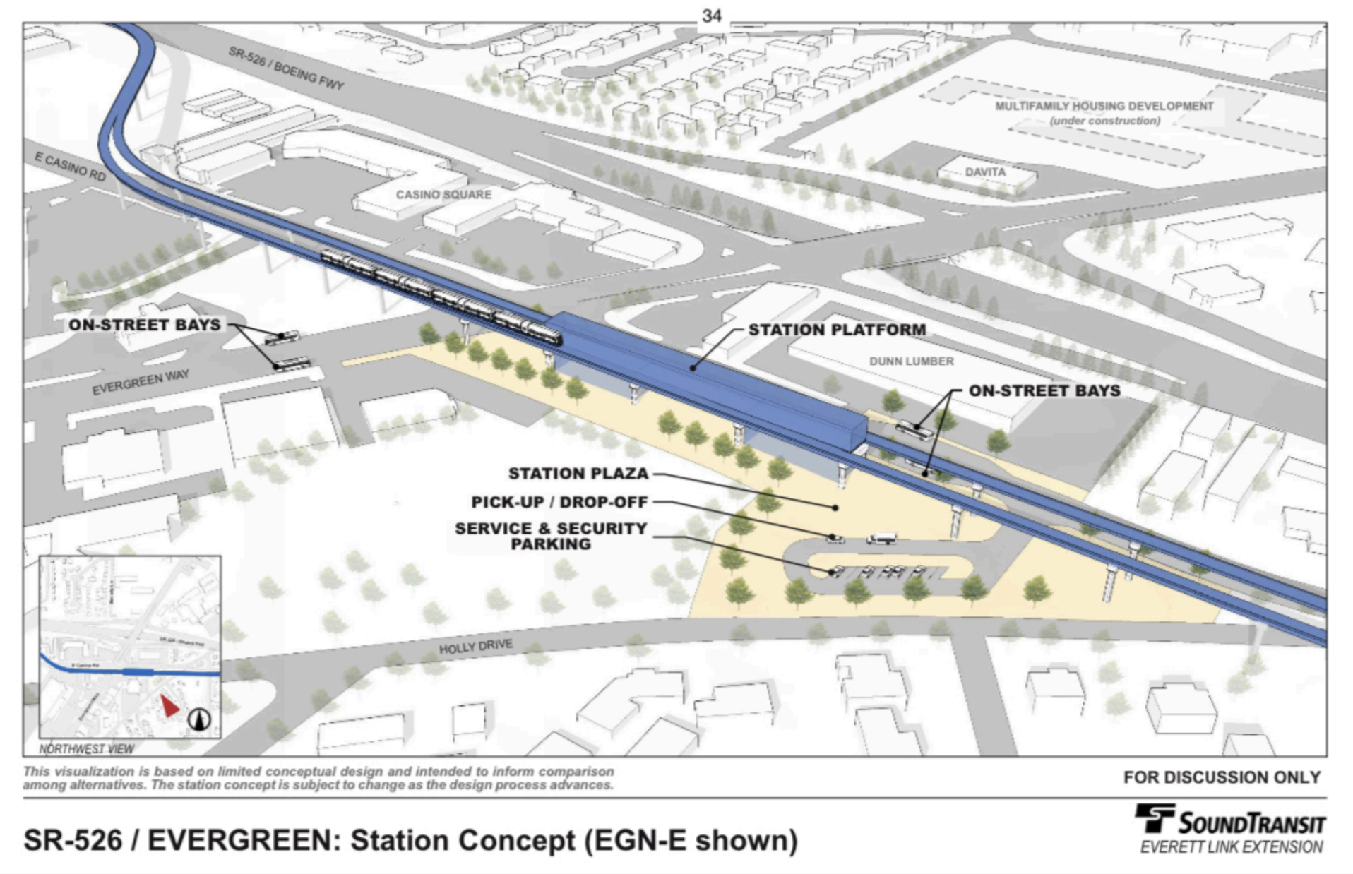 Once the alignment reaches toward Evergreen Way near SR 526, the remaining alternatives all leave a bad taste in the mouth. All of the alternatives south of SR 526 (EGN-B and EGN-E) would route the alignment through apartment complexes and commercial businesses in an area of primarily low-income and minority families and minority-owned businesses. On top of this, large station footprints would maximize commercial displacements because of Sound Transit’s peculiar obsession with unnecessary off-street bus facilities.