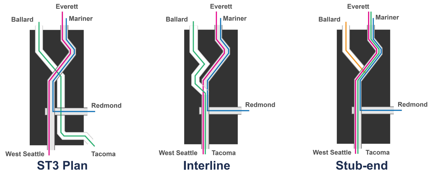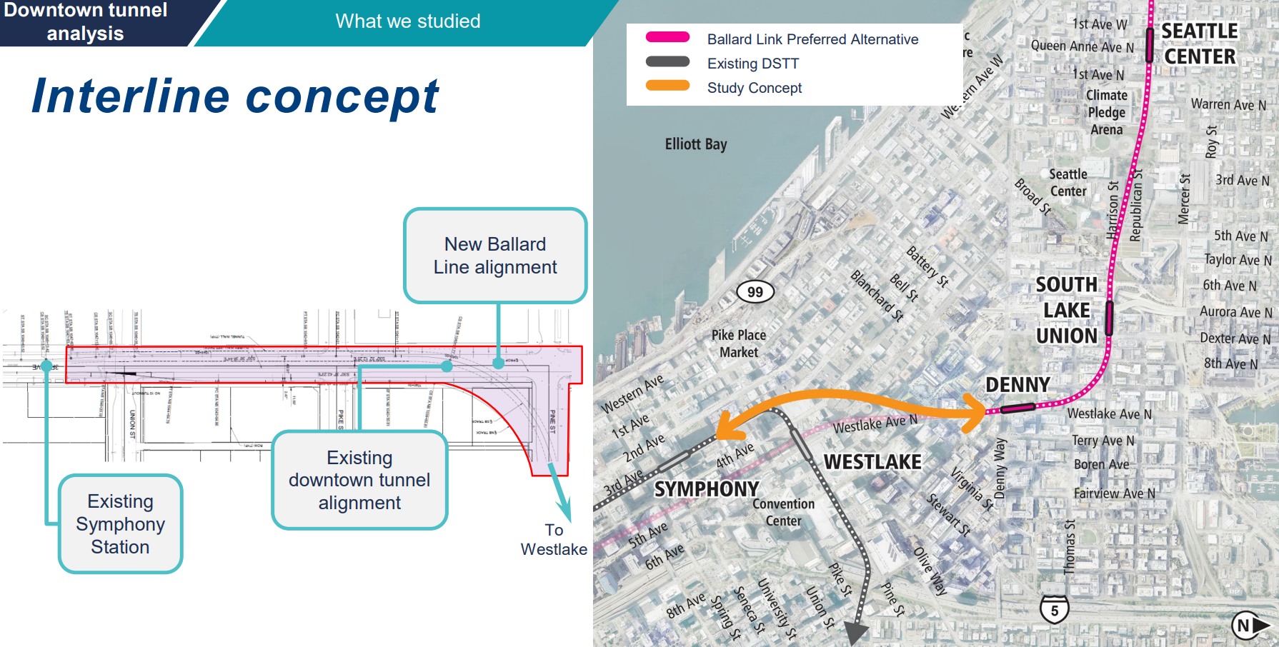 The interline option would mean major construction disruptions in the existing downtown tunnel (and the Third Avenue bus mall overhead) while the new underground interchange is built west of Symphony Station, tying Ballard Link into the tunnel. Across the existing tunnel, station platforms and vertical circulation would also likely need to be beefed up to handle three lines worth of passenger flow.