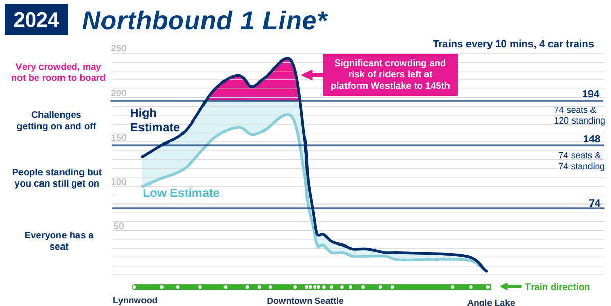 “With a train every ten minutes, with all four-car trains, we expect to see significant crowding northbound, on Link, in the afternoon peak hour, particularly between Westlake and Northgate. Three-car trains would be even more crowded,” Sheldon said. “At the high end of the ridership forecast, crowding could be severe for the entire peak hour at a level rarely observed, even during special events. And this could happen regularly, every day during the week. There is significant risk here that riders could regularly be left at the platforms.”
