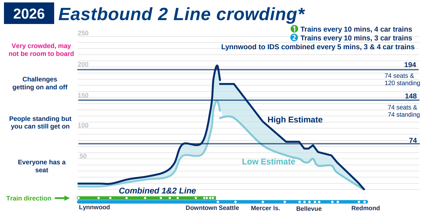 The delay to open East Link (2 Line) across Lake Washington means that service will start in Shoreline, Mountlake Terrace, and Lynnwood before 1 Line has access to a second operations and maintenance yard in Bellevue’s Spring District. As a result, Sound Transit expects demand to significantly outpace available space on its light rail vehicles along a pivotal portion of the future 1 Line during peak hours.