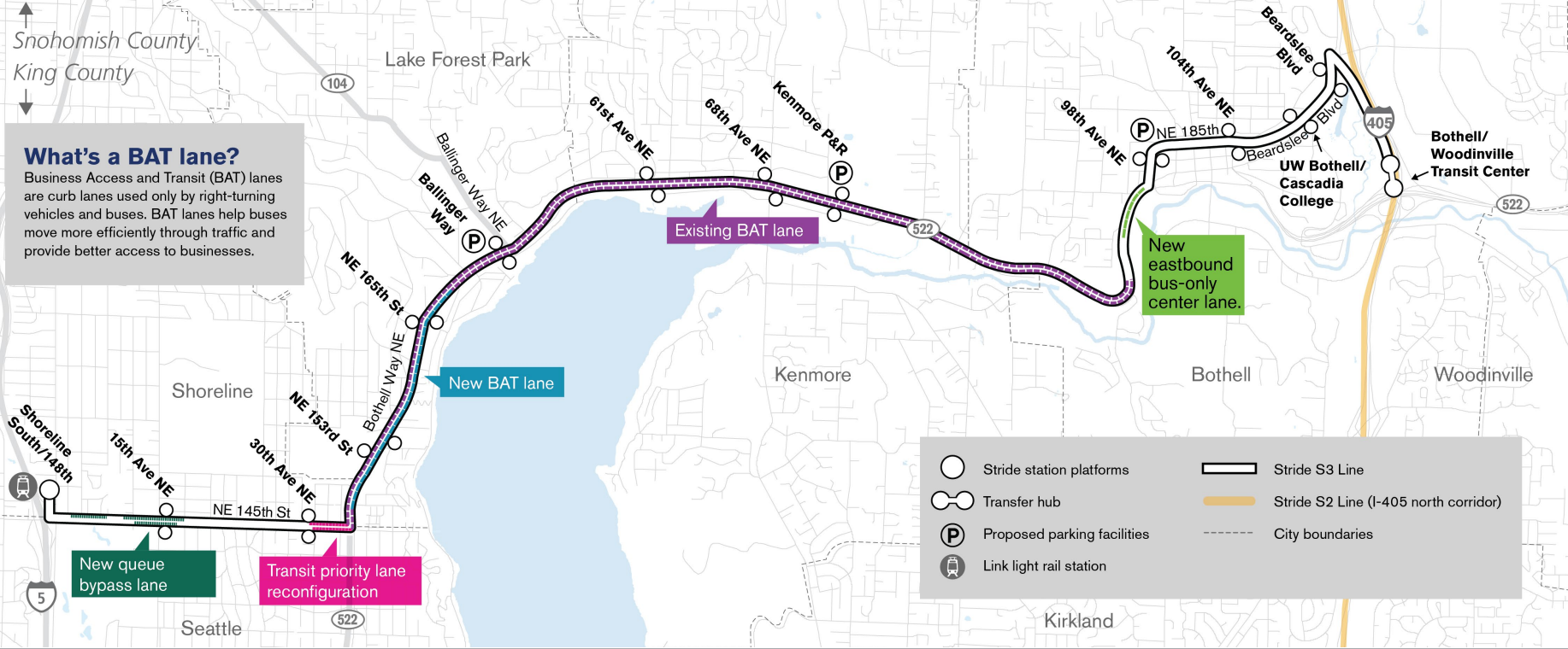 Most of the route already includes existing business access and transit (BAT) lanes that will provide buses with dedicated travel space while still providing drivers with a space to turn right into driveways. Many of those stretches of BAT lane were built by local cities along the route, including Kenmore and Bothell, over the past few years, in anticipation of the S3’s eventual arrival. As part of this phase of construction, Sound Transit will build a northbound BAT lane through a 1.6-mile stretch of Lake Forest Park, along with targeted transit improvements elsewhere along the route and upgraded stations at stops.
