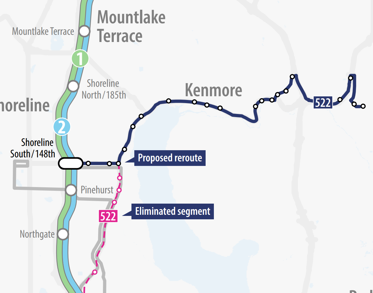 This fall, Sound Transit will switch the routing of the existing 522 bus to follow the future S3 line’s routing, cutting out the portion of the route that covers Lake City Way in Seattle and instead routing buses directly to the Shoreline South light rail station. With that change, King County Metro will implement two new bus routes, the 72 and 77, to cover that new gap in Lake City.