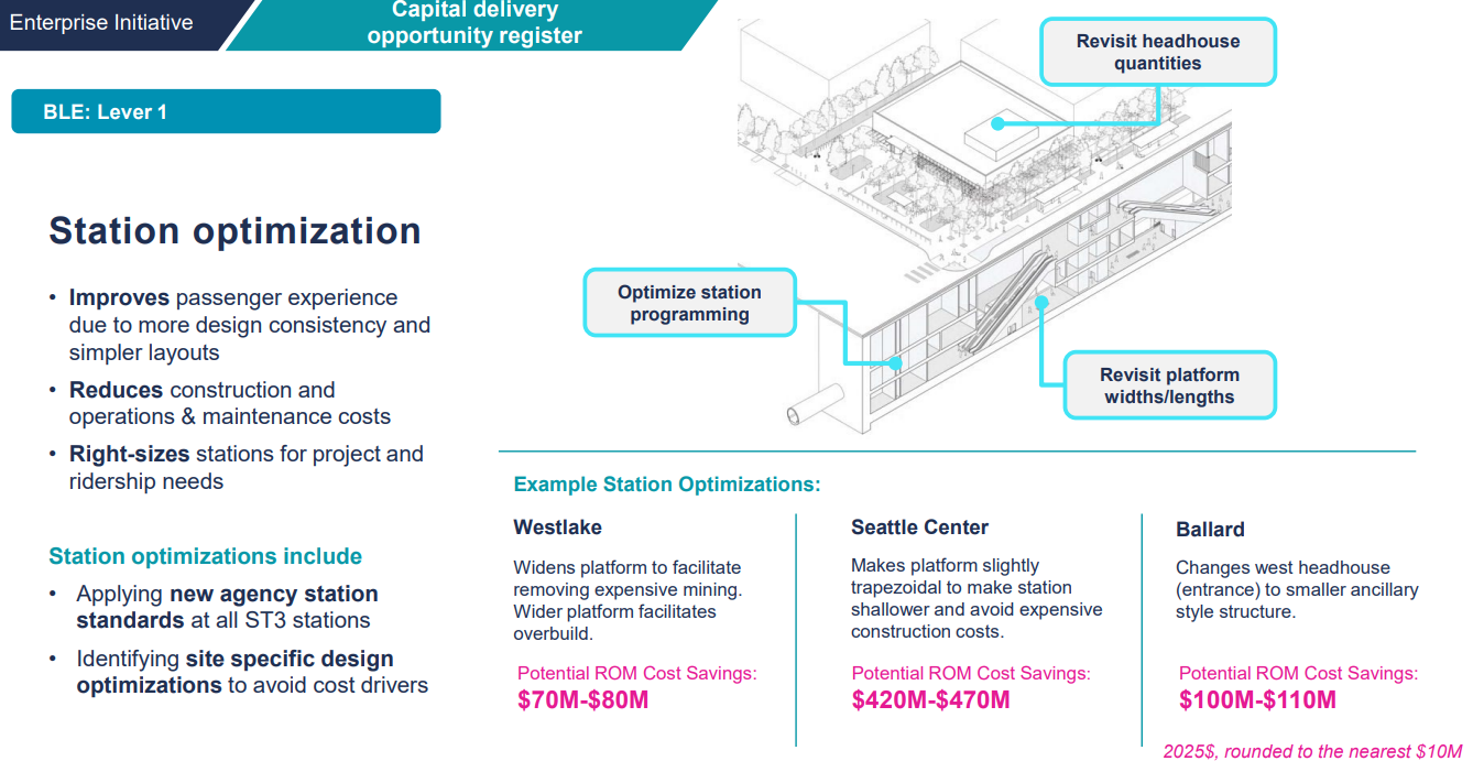 Sound Transit staff have been putting cost savings measures into four different tiers, or “levers.” The levers ramp up in complexity and potential impact on riders or agency operations: lever 1 is relatively straightforward changes that are clear no-brainers. Lever 2 changes are slightly more complex, and lever 3 changes are the type that would need buy-in from local governments and other stakeholders due to their significant impact on the project’s scope and footprint.