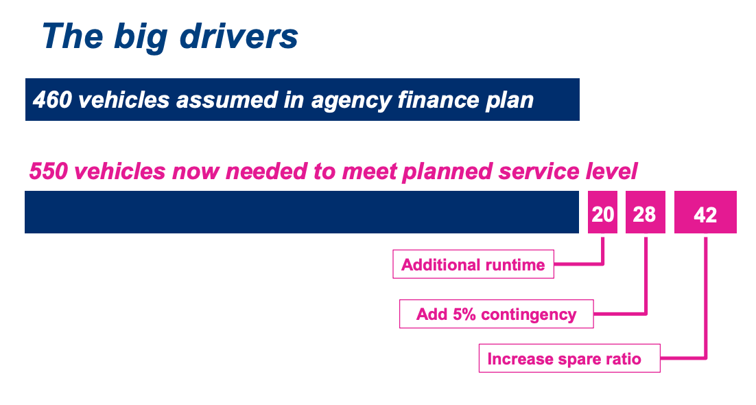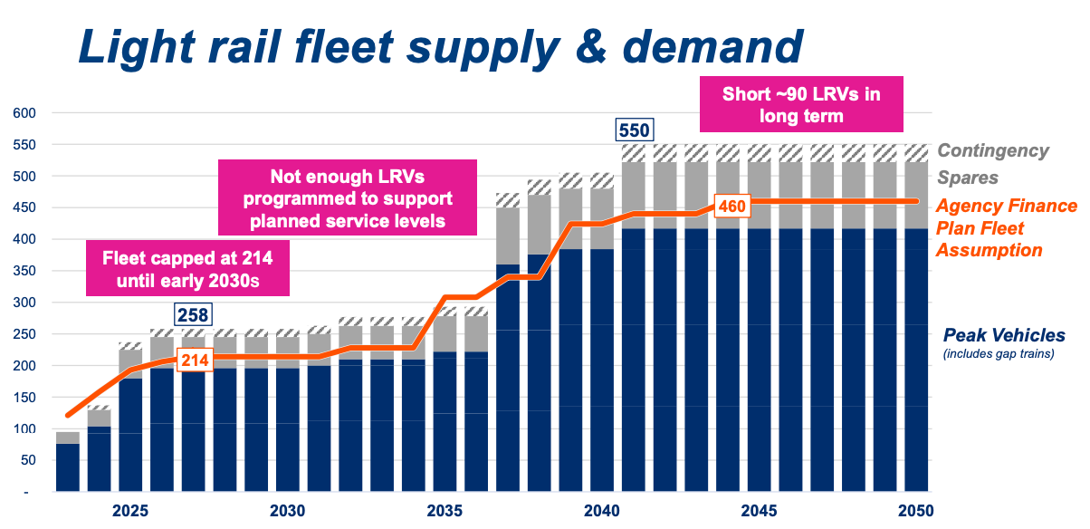 In allocating the 90 or so additional LRVs needed, Sheldon said that 20 are needed for additional runtime, 42 are needed for spares, and 28 are needed as a contingency. The problem, however, is that the agency hasn’t budgeted for these additional vehicle needs or the space to store and maintain them under the finance plan.