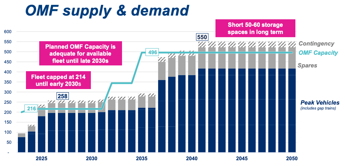 Underpinning the forecasts, planners are assuming that all Link lines will have six-minute peak-hour frequencies by the 2040s and that fleet will progressively grow to a total of 460 LRVs. Operations and maintenance facility (OMF) capacity is also planned to reach to 496 LRV spaces by the mid-2030s.