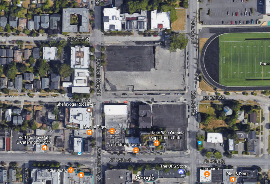 Two weeks ago, Sound Transit held an open house to discuss priorities and strategies for transit-oriented development (TOD) on nearly a full block bounded by Roosevelt Way NE, NE 66th St, 12th Ave NE, and NE 67th St. Two small sites north and south of the main block could also accommodate TOD, according to Sound Transit.