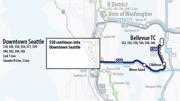 - Route 550 (Seattle-Bellevue) would benefit from increased Sunday service with 15-minute frequencies throughout the day. This would be accomplished by reallocating some weekday morning peak-hour trips and possibly others. In 2023, the East Link line will open and replace this route, making enhanced Sunday service a good move to encourage everyday ridership ahead of the change.