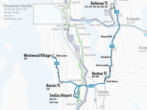- Route 560 (West Seattle-SeaTac-Bellevue) would benefit from increased weekend day frequencies, improving from every hour to every 30 minutes. Like Route 535, much of this route will eventually become a bus rapid transit service this decade, so higher frequencies here make sense ahead of that change.