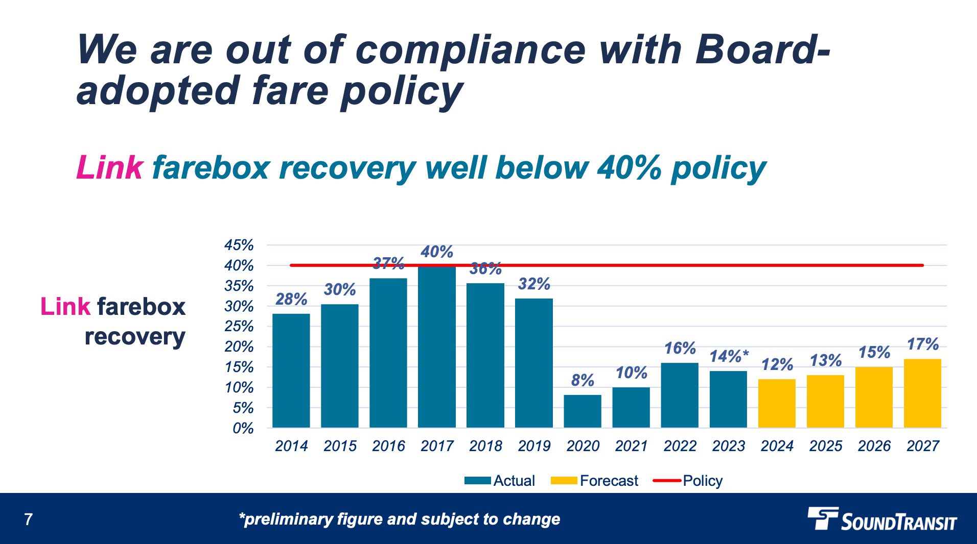 Immediately before the pandemic, Sound Transit was reaching farebox recovery rates of 32% on Link, 31% on Sounder, and 25% on ST Express. Link hit a record high 40% farebox recovery in 2017, but farebox recovery began to dip in the intervening years, until plummeting to just 8% at the height of the pandemic.