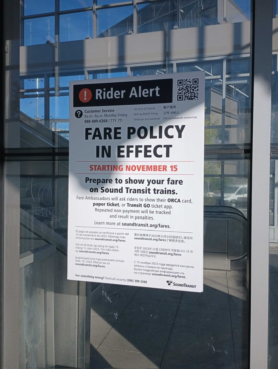 Notices recently started appearing at Link stations to warn riders that more stringent fare enforcement would go into effect later this month. Sound Transit is stepping up penalties for repeat offenses of agency fare policies.