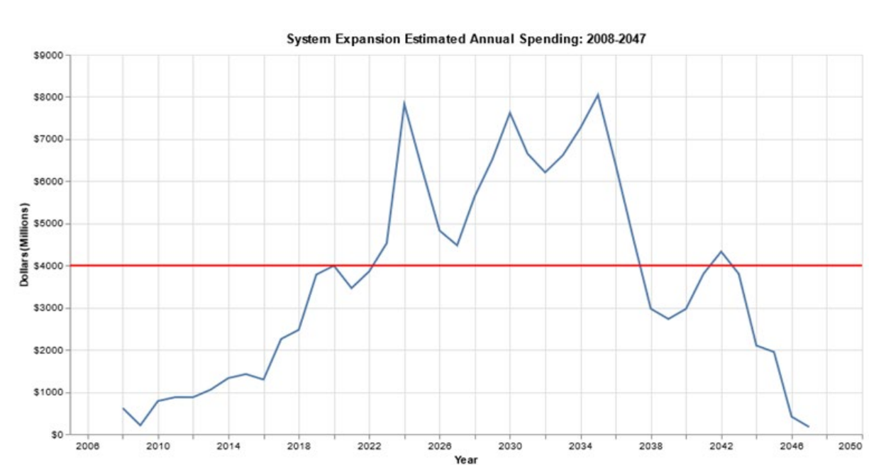 The TAG had a leading message for the Sound Transit board: focus on the immense wave of capital expenditures coming to the system. These are poised to quickly rise as Sound Transit moves into new major construction projects in the next few years. TAG member Grace Crunican told the board, “By comparison, in 2024, the program that you have ahead of you is about five times bigger than what you did in 2016.” Next year, in fact, the capital program is set to top $8 billion and exceed $4 billion per year through the late 2030s. That’s a lot of spending requiring many board actions, all needing to be taken while the board is already busy with its current workload.