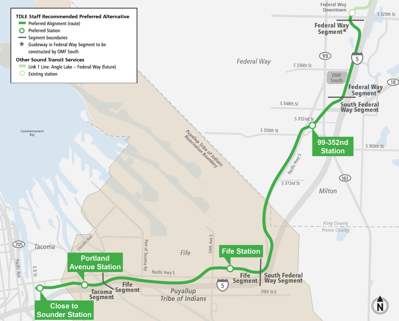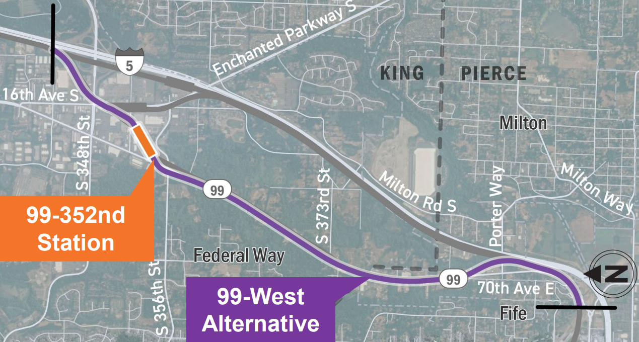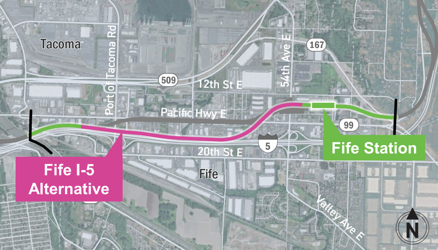 For a station in Fife, the new preferred option would be built in the middle of the city center, away from busy 54th Avenue E. From there, the route is set to head back to I-5, avoiding construction impacts along SR 99. But with no additional stations planned along that stretch, the tradoffs are more clear here, with a 99 alignment leading to the displacement of significantly more businesses.