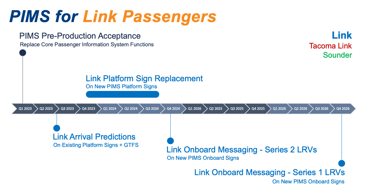The first phase of implementation will be predictive Link 1 Line arrival times via existing digital screens at stations and mobile apps that are powered by GTFS. That should be coming online in the next month or so. More features are ahead, but Ginsberg cautioned that the more sophisticated PIMS technology will come later and is tied to the East Link starter line schedule.