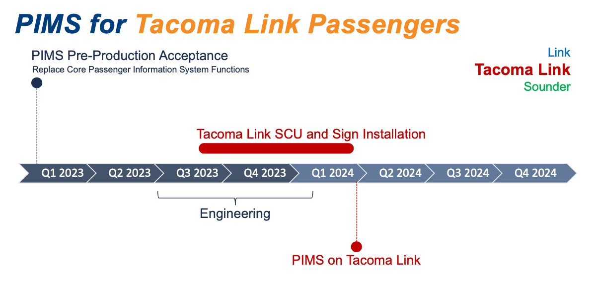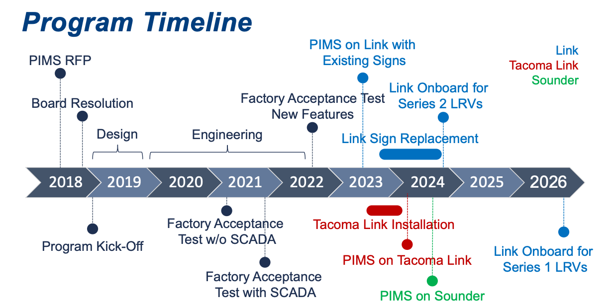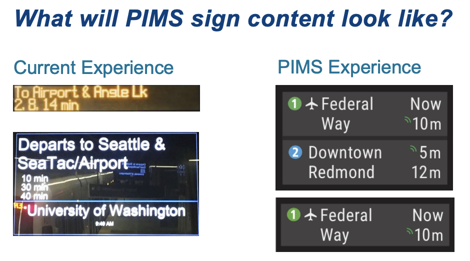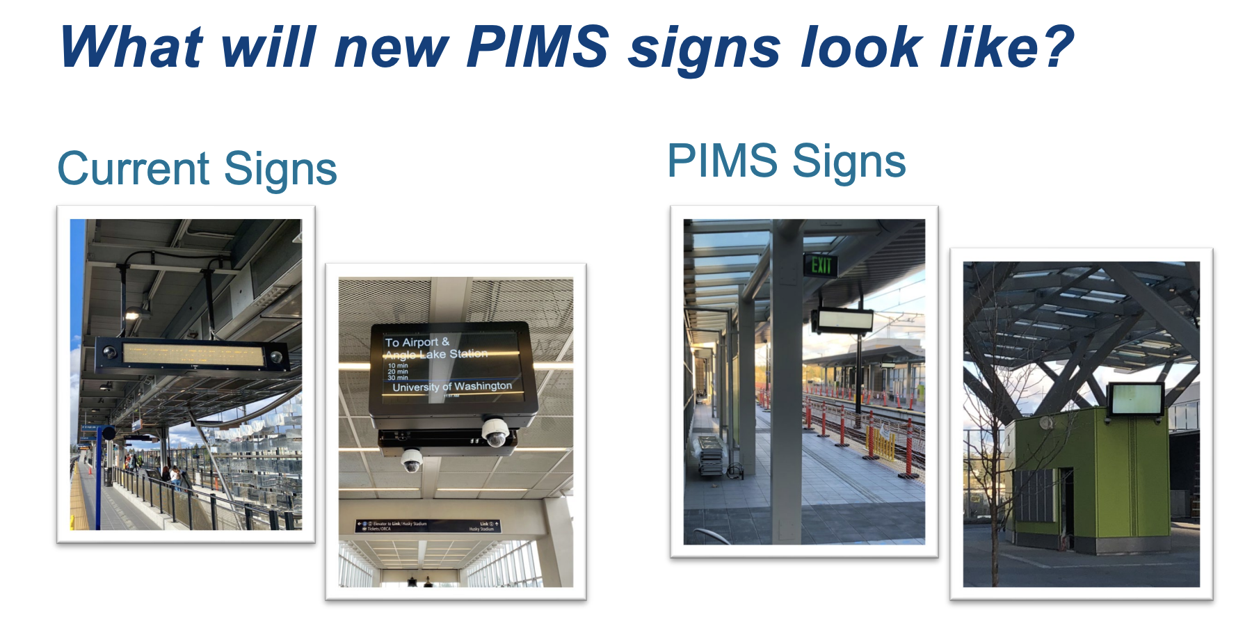 As for Sounder commuter rail, design work for PIMS is already completed but engineering and installation will come in waves. Digital screens are already being installed on vehicles, and the installation at stations will come this fall. The installation process is expected to wrap up before next summer and full activation could come later next year.