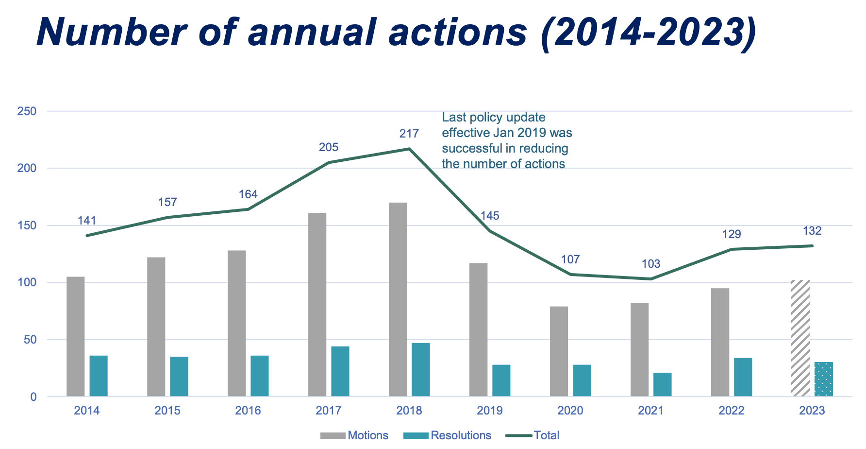 A previous effort to increase delegation of authority to the CEO was quite successful in reducing the number of actions related to contracts, agreements, and other financial decisions. Between 2018 and 2019, the number of actions fell from 217 to 145. Those numbers further fell during the pandemic, but have since bounced back to around 2019 levels.