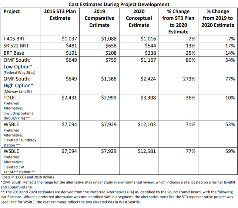 While the Ballard and West Seattle light rail extension numbers were the most dramatic, all Sound Transit 3 light rail lines are seeing cost escalations. The Tacoma Dome Link Extension costs have climbed from $2.4 billion in 2015 to $3.3 billion as of the update yesterday. The culprit there is the agency’s determination that an extra three miles of elevated rather than at-grade rail will be needed due to concerns about drainage and disrupting indigenous burial sites as the route passes through the Puyallup Reservation.