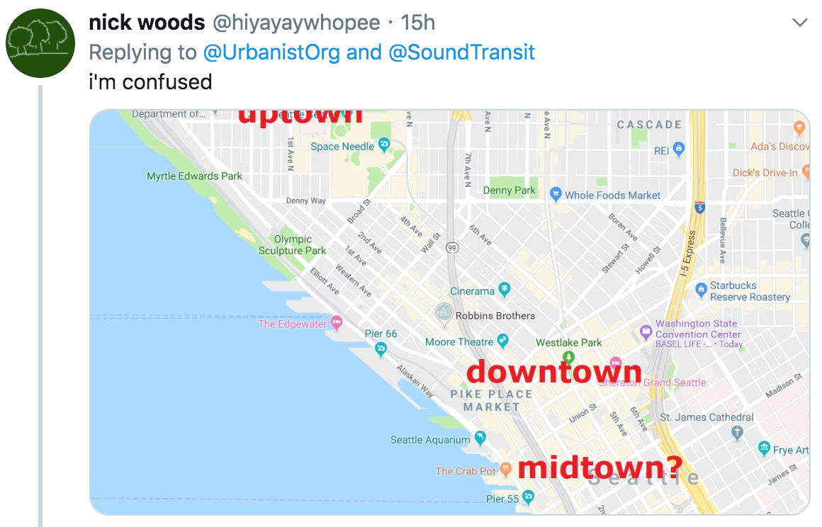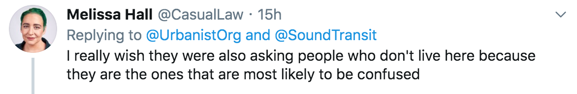 Sound Transit has introduced other possible confusion points across the light rail system, having settled on “Shoreline South/145th” and “Shoreline North/185th”, “South Bellevue” and “Bellevue Downtown”, and several Redmond-named stations. While they are all geographically named, they do lend themselves to mistakes by less geographically-adept passengers and could serve as why the transit agency should take much more care in using street names, landmarks, and neighborhoods in choosing names for usability and legibility of the transit system.
