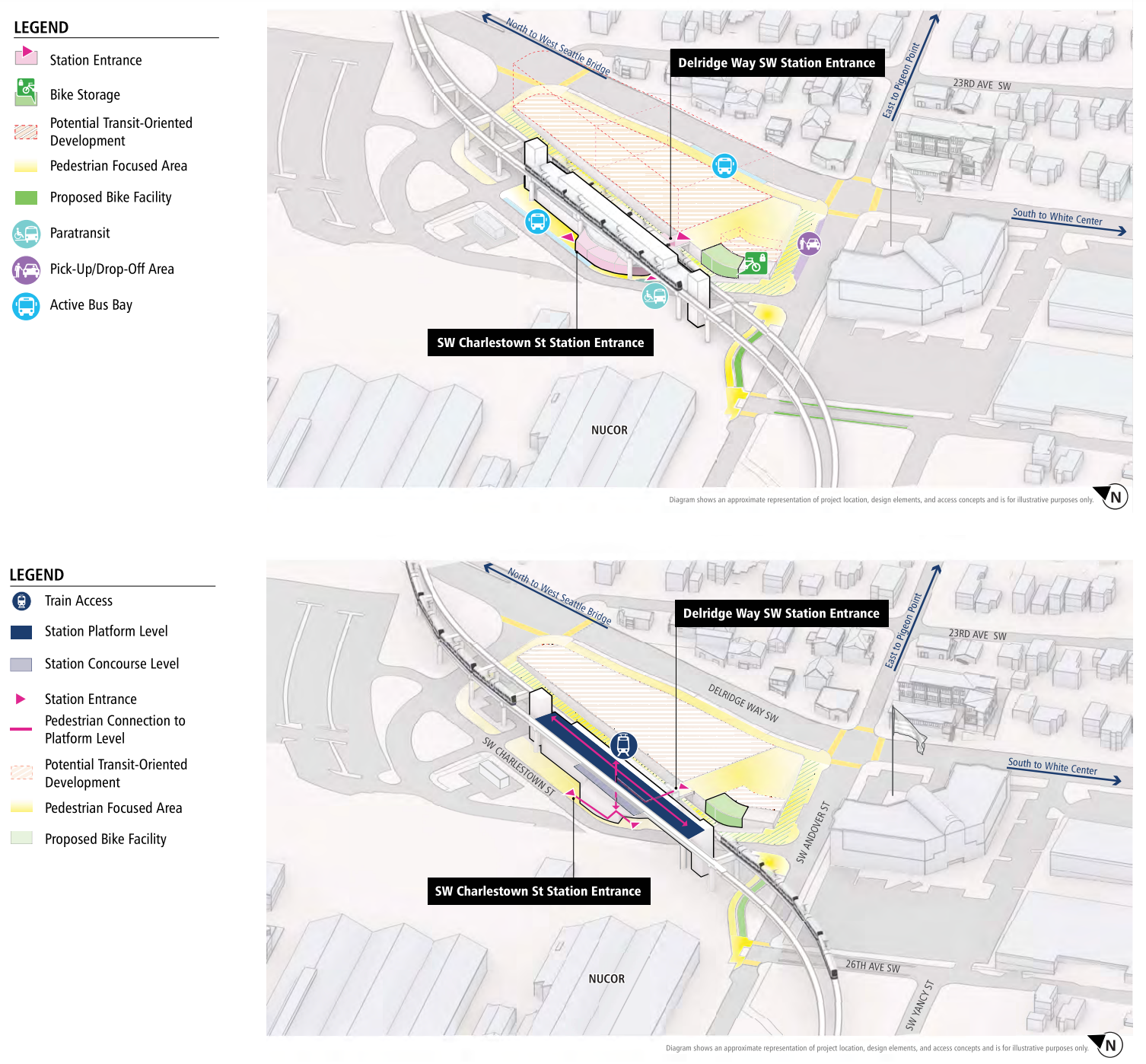 Most station amenities would be located under the elevation platforms and guideway, but Sound Transit has drafted plans for bike storage in an accessory building. Bus bays would be scattered about on Delridge Way SW and near the station entrance on SW Charlestown Street.