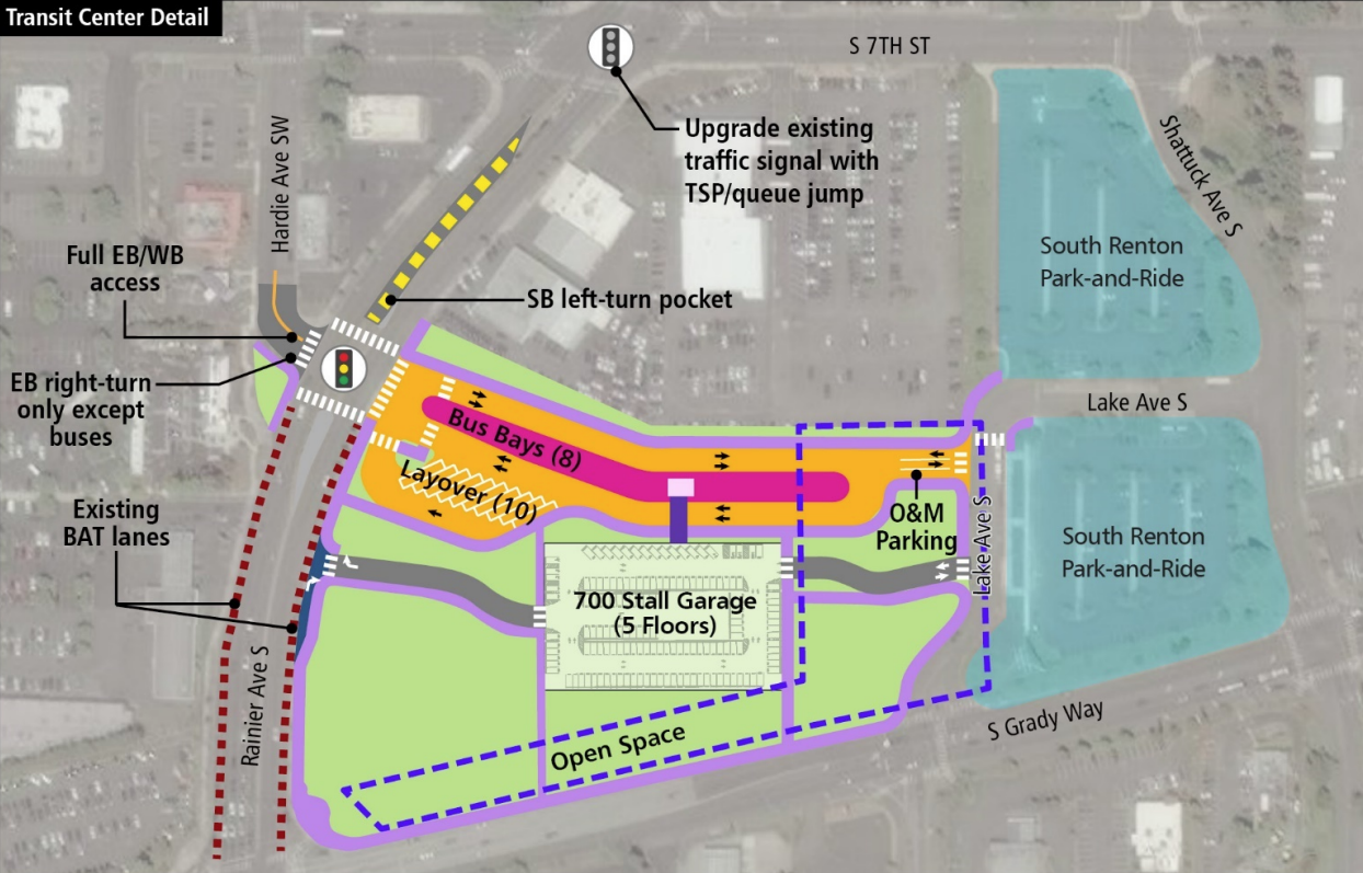 A 700-stall parking garage is planned as part of the South Renton Stride station, but shortfalls in Sound Transit’s overall financial plan have led to its construction being postponed, and it’s currently scheduled to open no earlier than 2034. Garages at NE 44th Street in Renton and at Kingsgate in Kirkland have also been deferred to around the same time. This may ultimately end up being a blessing given the fact that the last thing the Rainier/Grady Junction area needs is more parking, with some time for the agency to reassess spending transit dollars on parking down the line.