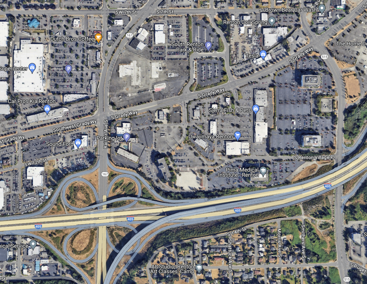 The City of Renton is working on a development plan for the broader Rainier/Grady Junction neighborhood, which currently consists mostly of surface parking lots and one-story retail buildings along wide arterial streets. But as part of the station construction project itself, now partially funded via this new grant, Sound Transit won’t be constructing any infrastructure that lessens the impact of having a new transit center wedged in between three state highways, including I-405 a few hundred feet away.