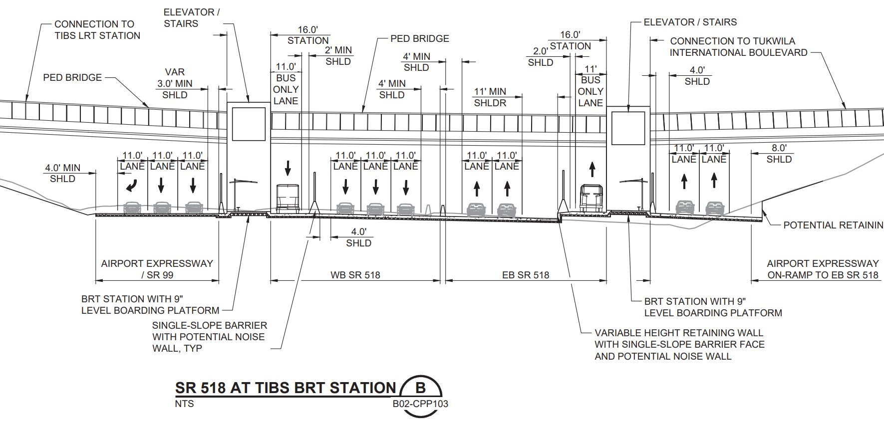 The Tukwila International Boulevard Stride station (TIBS), to be built immediately adjacent to the existing Link light rail station in Tukwila, will be constructed directly adjacent to the State Route 518 ramps, with passengers boarding and alighting from buses between the highway lanes. Pedestrian bridges will be the only way riders are able to leave the station.