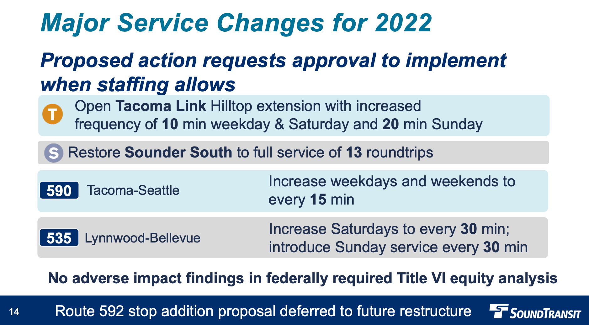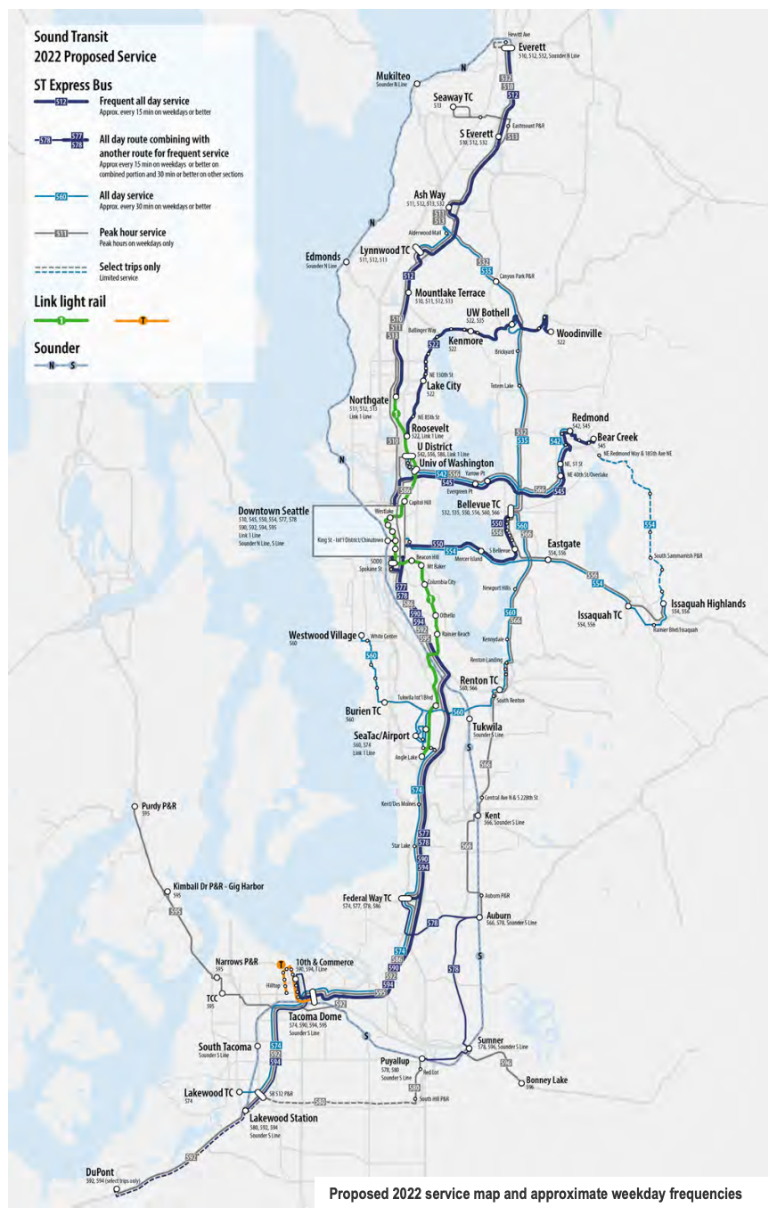 Given this context, Sound Transit still plans to move forward with the 2022 Service Plan and its service revisions and enhancements. However, this year’s approach is different and largely without specific timelines for implementation. The agency intends to implement the plan equitably throughout its service area with a focus on Pierce County and South King County that are underserved and have had higher rates of sustained bus ridership. Service improvements will hinge on partner agencies have staffing levels to accommodate the plan, which means there will need to be quite a bit of flexibility in implementation.