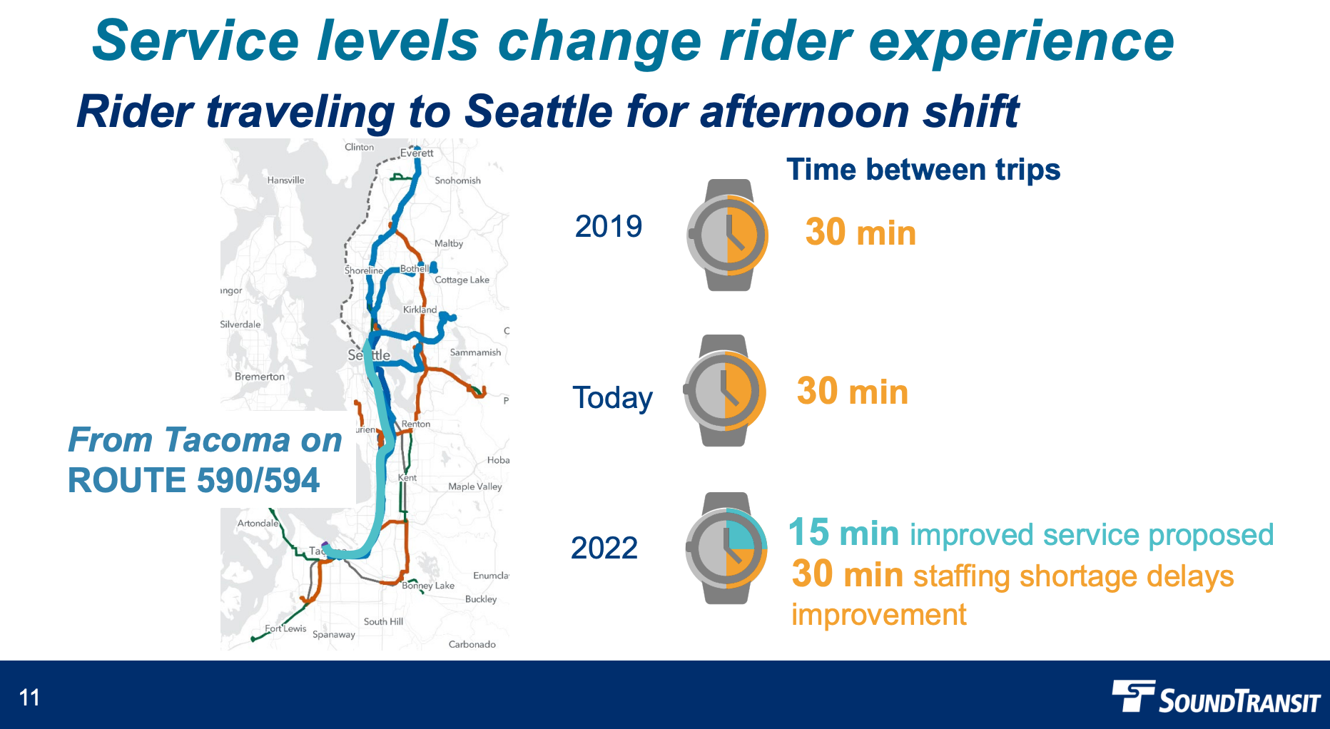 During the briefing, Sound Transit service planner Michael Couvrette emphasized the challenges and risks that widespread staffing shortages are creating for service. “The recent operator shortages, which are impacting transit agencies across not only our region but also across the country, have impacted ST Express bus service with an increasing trend of missed trips over the past few months that have reduced the predictability of service providers,” Couvrette said. In response to this problem, Pierce Transit will temporarily cut back service on some Pierce Transit and Sound Transit bus routes starting on Sunday. This cut back will be strongly felt by Sound Transit riders in Pierce County and South King County as Pierce Transit-operated ST Express bus service will be reduced by about 10% or 61 daily weekday trips.