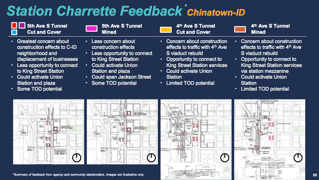 - Chinatown-International District: $200 million less for the E-3 surface busway (5th Ave S cut-and-over tunnel) option;