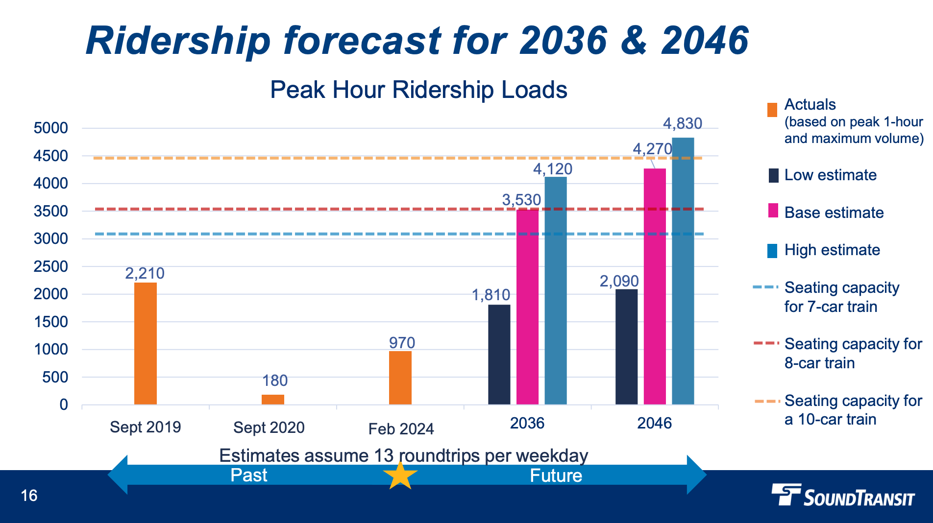 As a result, Saxe recommended that Sound Transit postponing platform extensions and 10-car trains until 2046 and speeding up the timeline on additional trips, increasing service beyond 13 regular weekday roundtrips and special event service.