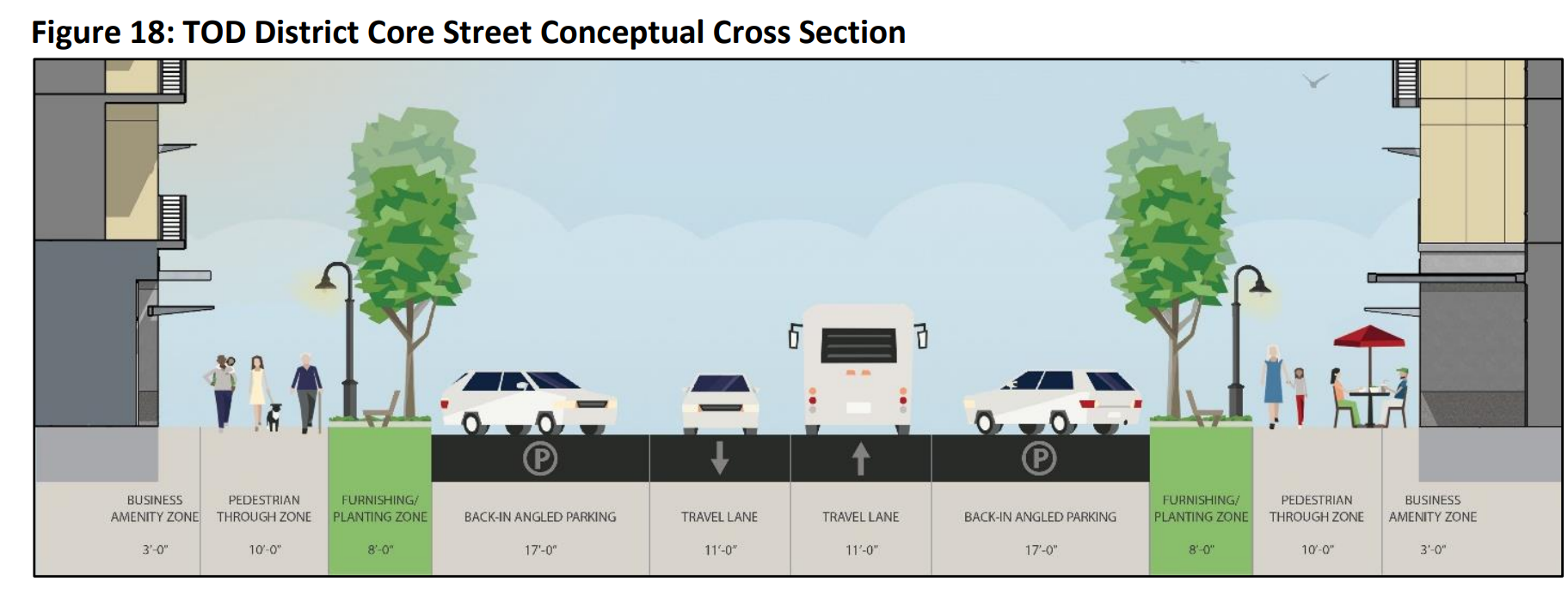 Despite the ability to create these streets from scratch, the initial concepts included in the plan reinforce the car-dominated nature of the area, prioritizing space for back-angled parking on what are supposed to be the new neighborhood’s inviting main streets. Bike facilities are missing from the initial cross-sections entirely.