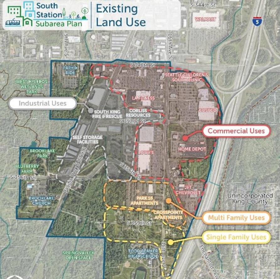As Sound Transit prepares to extend the 1 Line into downtown Federal Way in 2026, the City is looking ahead to its second light rail station, currently set to open by 2035 as part of the Tacoma Dome Link Extension. The exact location of a station in South Federal Way is still up-in-the-air, but this month the Federal Way City Council approved a plan intended to pave the way for a new mixed-use neighborhood within walking distance of frequent transit.