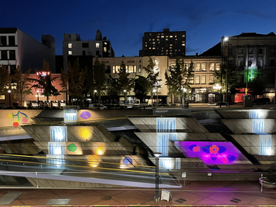 At Pierce Transit’s Commerce Transit Center in Downtown Tacoma, a new artwork installation has been completed. Mini-Tahoma, as it is known, is featured on the Waterwall at the transit center. It showcases a large mural detailed in floral motifs and flowing water. At night it is illuminated to emphasize the features and really bring out the colors.